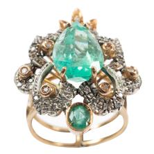 ANELLO in oro giallo 9 KT e argento con diamanti e smeraldi