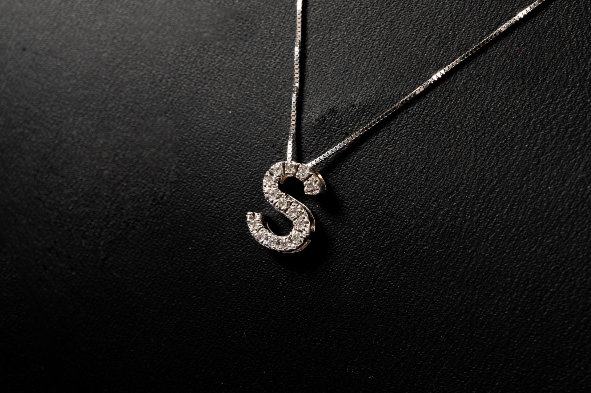 COLLANA in oro bianco 18 KT con pendente a forma di "S" con diamanti taglio brillante ct. 0,10 H color VVS 2 (g. 1,85).