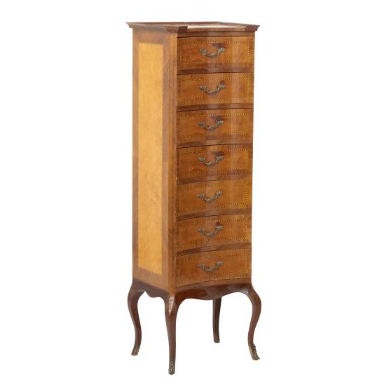 CARRELLO porta bottiglie in legno di mogano con tarsie in varie essenze di legno, ringhiera in ottone.