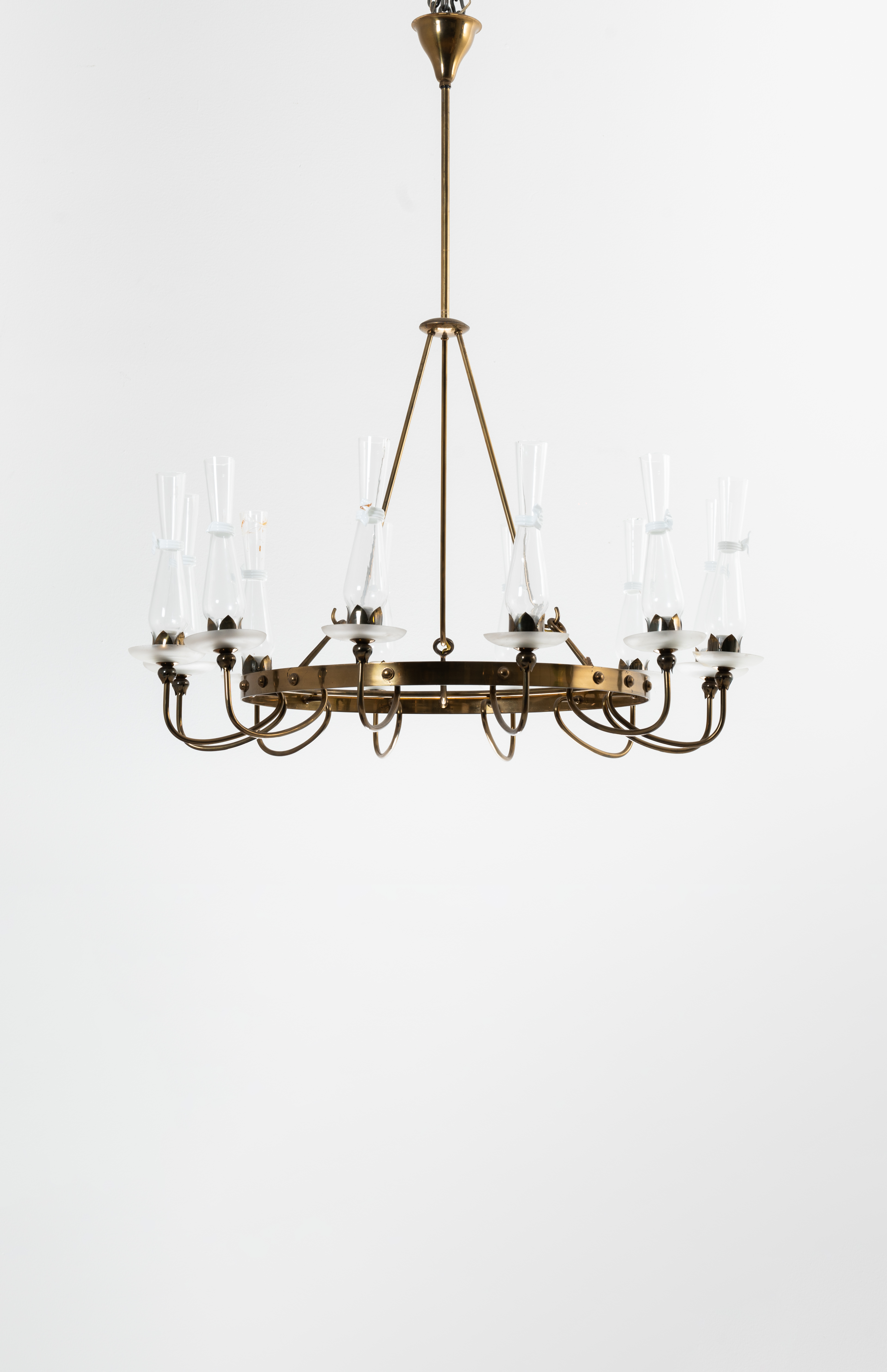 Lampada a sospensione a dodici luci con struttura in ottone, diffusori biconici a goccia in vetro trasparente con fascia di decoro in vetro lattimo, piatti in vetro satinato. Segni del tempo.