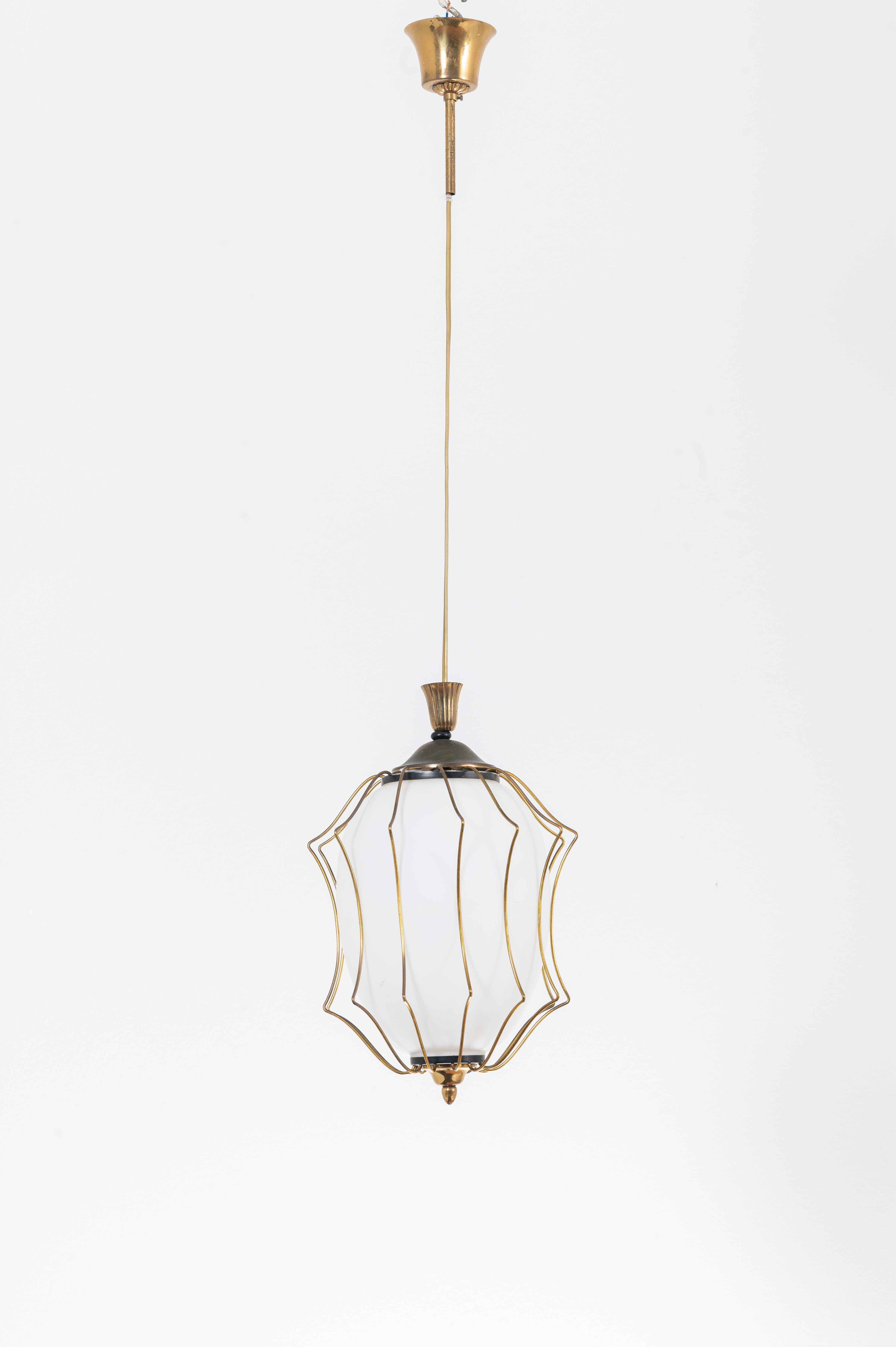 Lampada a sospensione ad una luce con struttura in ottone e metallo verniciato nero, diffusore ovalizzato in vetro opalino ed ingabbiato in struttura sagomata di ottone.