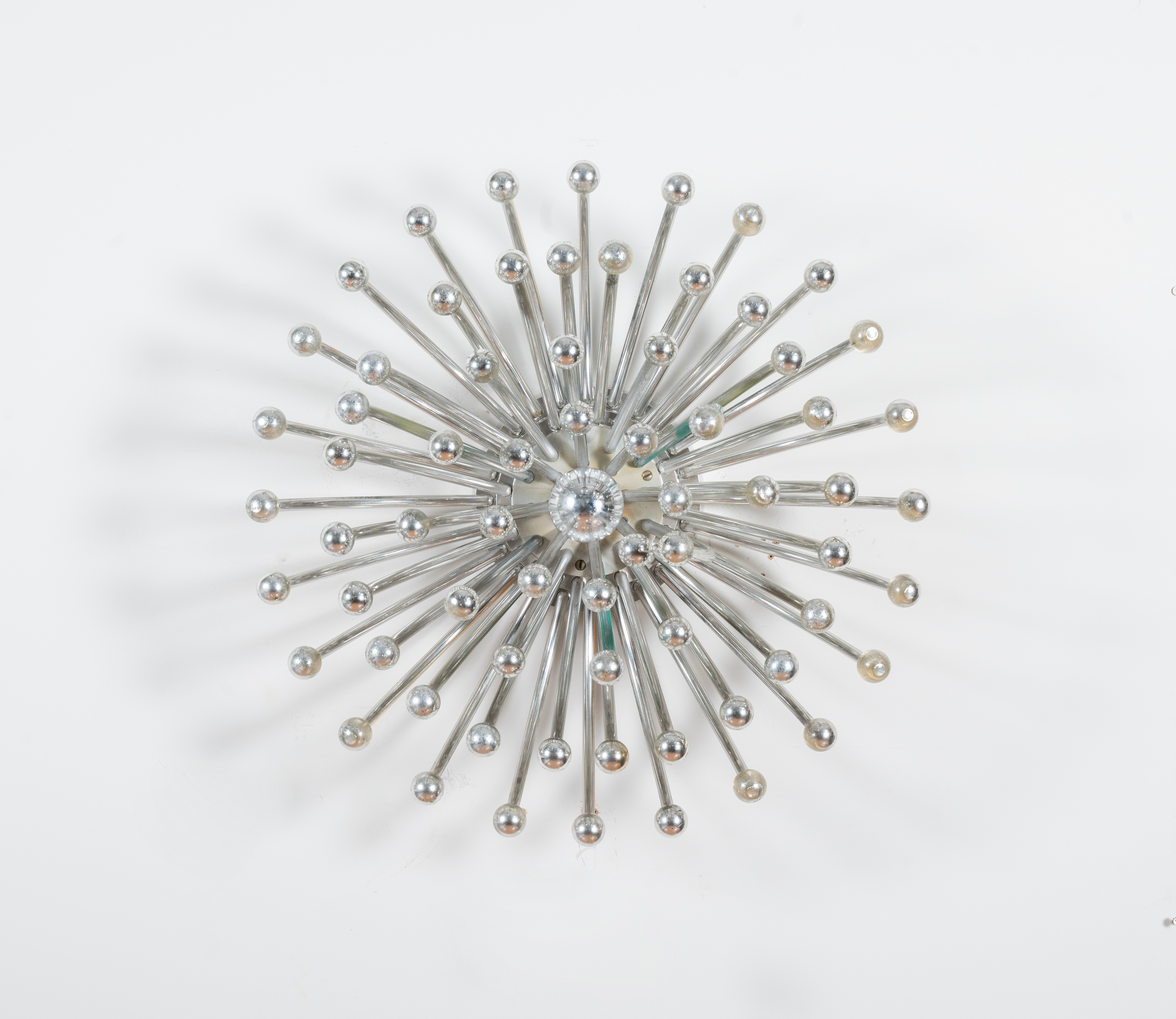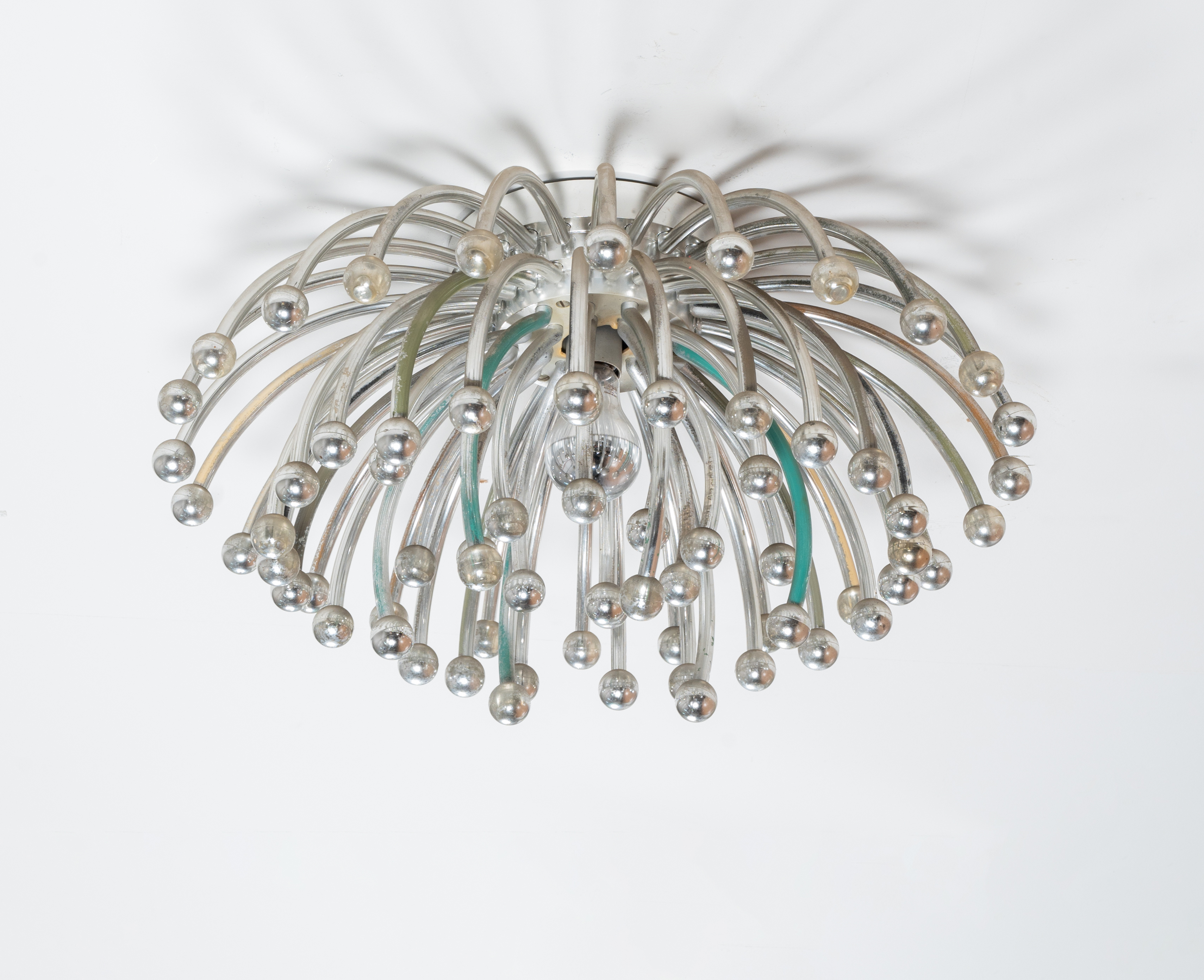 Lampada da soffitto/parete ad una luce modello “Pistillo”, diffusore semisferico composto da elementi curvati in resina termoresistente metallizzata.