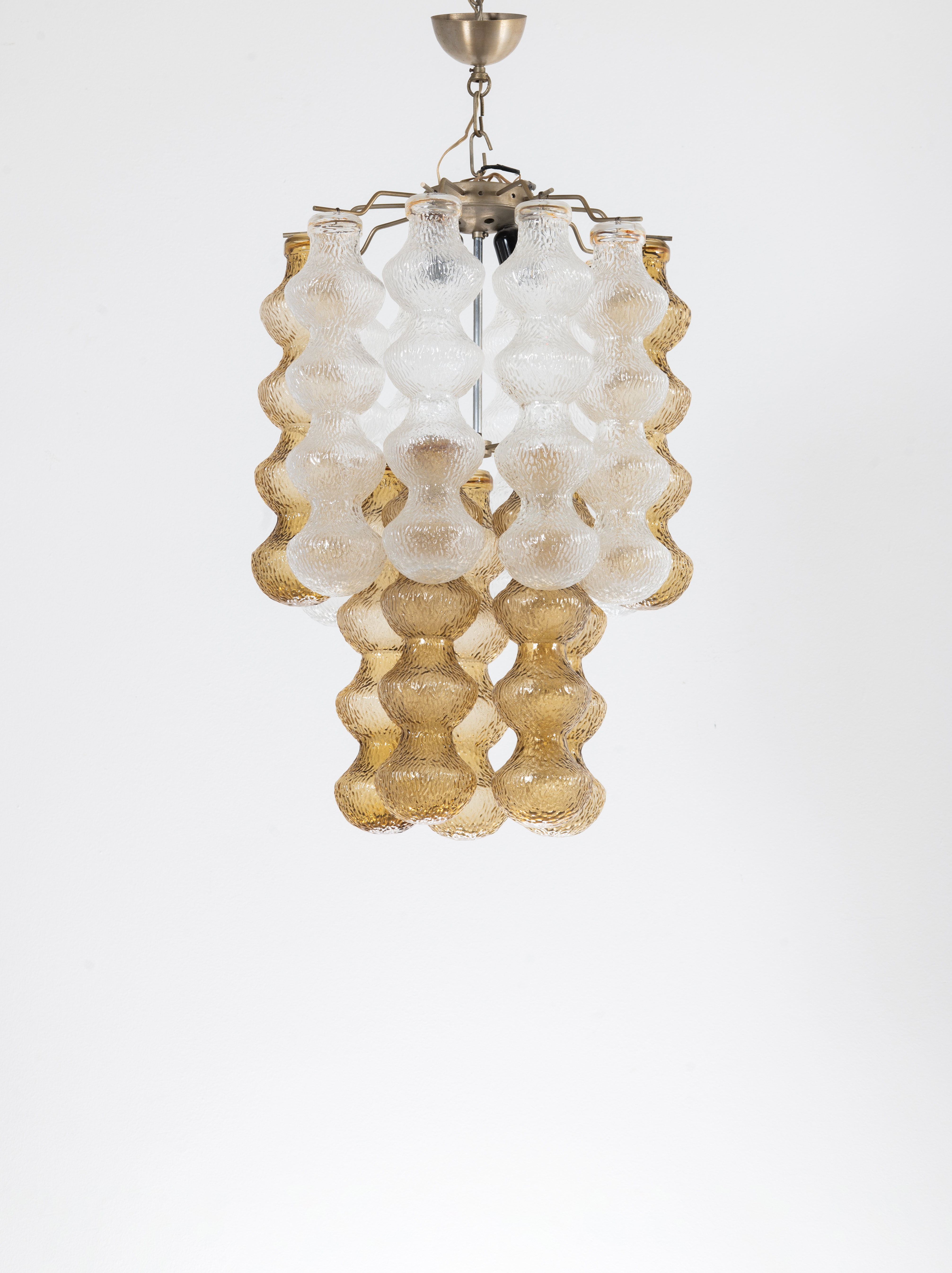 Lampada a sospensione a due luci, struttura in metallo cromato, diffusori in vetro corteccia ad elementi a gocce sovrapposte cave in vetro incolore e ambra.