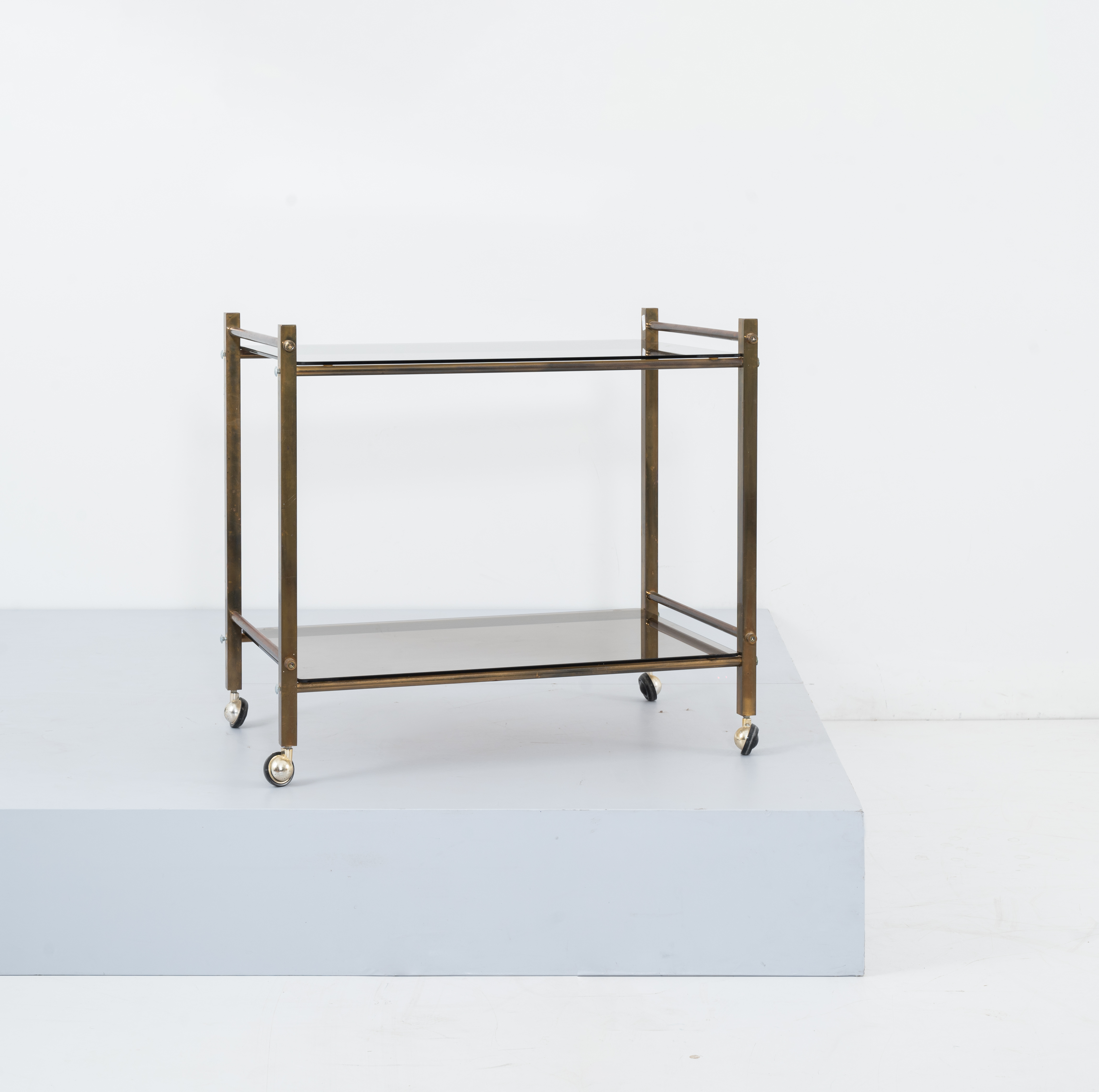 Carrello da servizio con struttura in metallo dorato, piano e sotto piano rettangolari in vetro fumè, ruote sferiche in metallo. Segni di uso.
