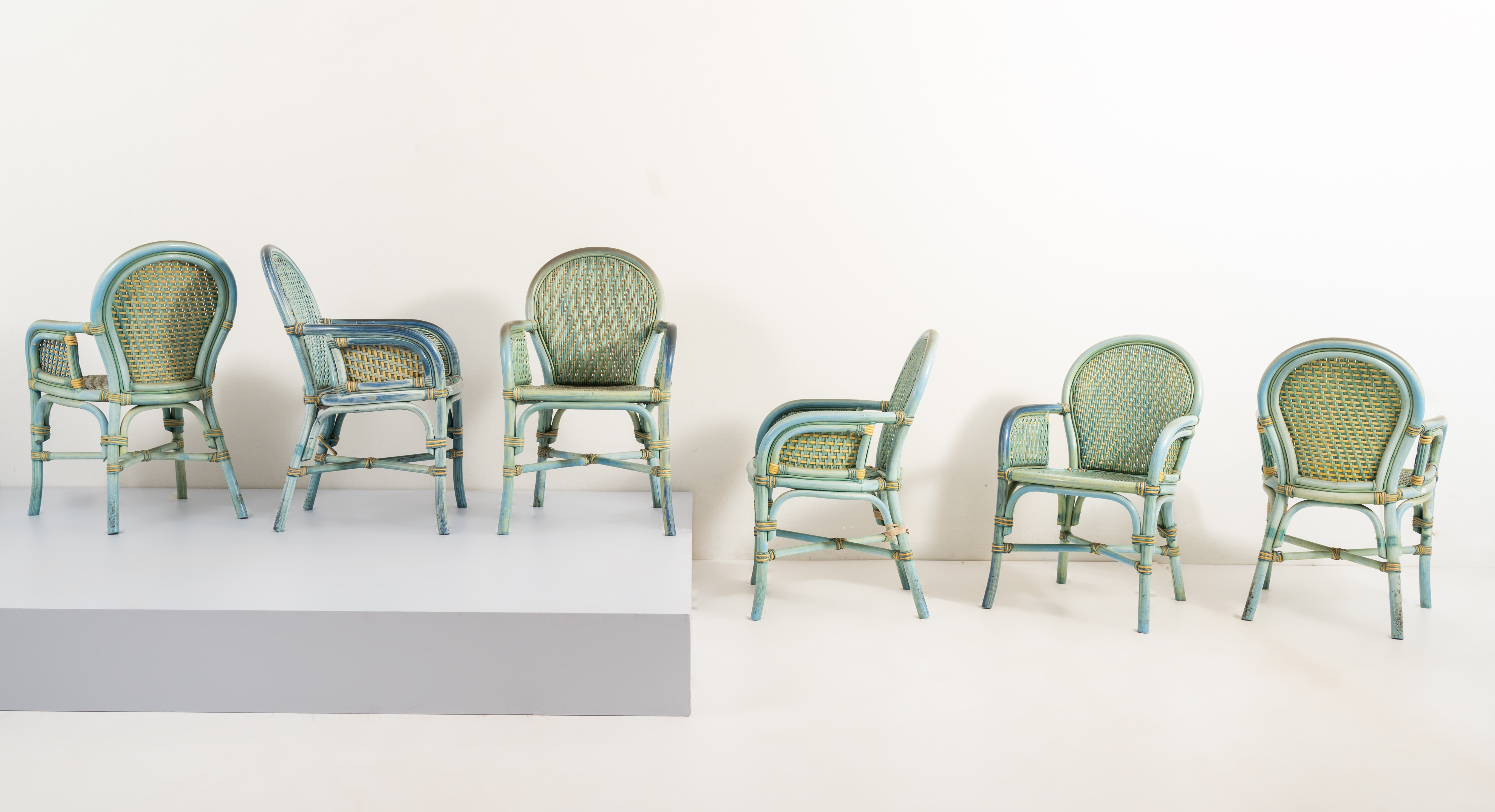 Sei poltrone in bamboo e rattan celeste e avorio, spalliera curvata, braccioli, spalliera e seduta in rattan intrecciato.