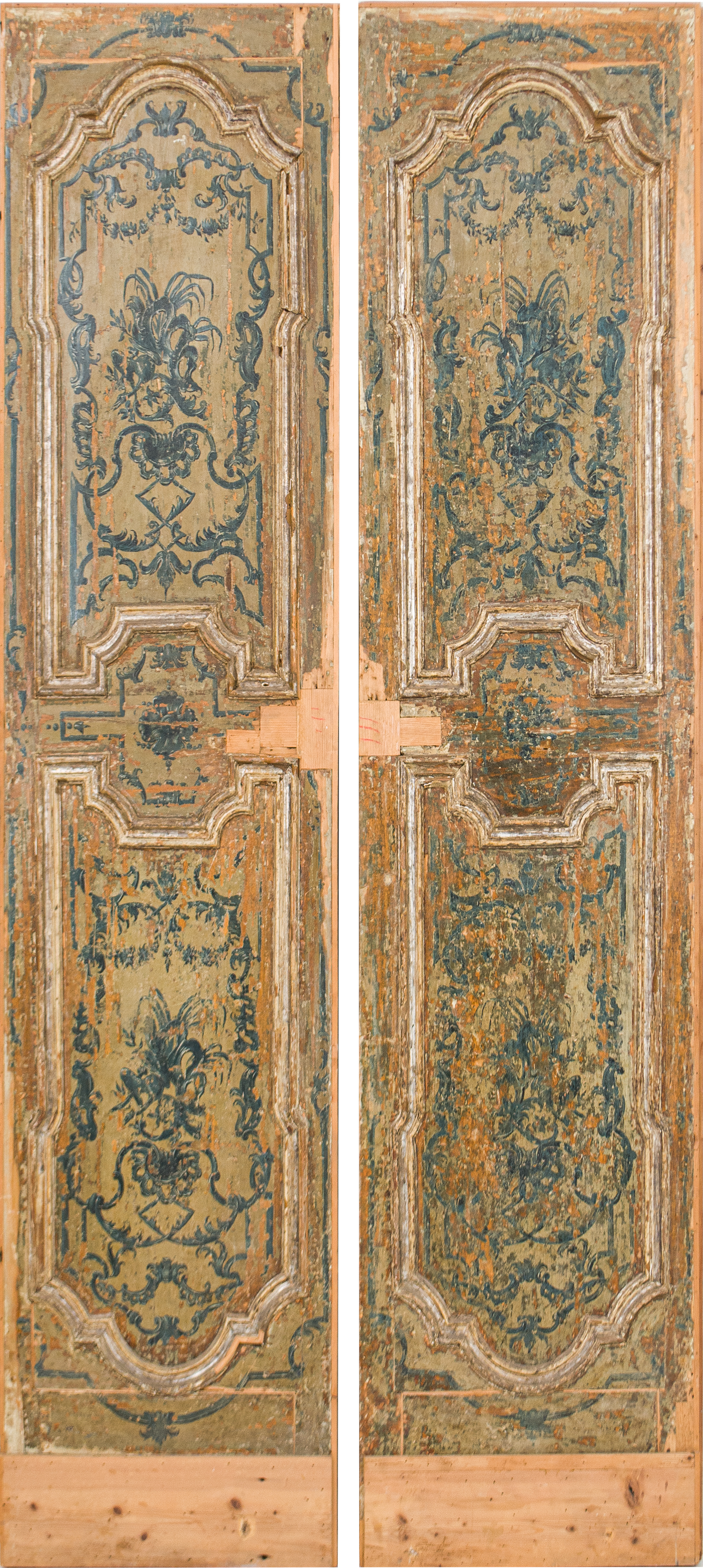 Coppia di porte in legno laccato e decorato a motivo vegetale con modanature dorata ad argento e mistura (restauri)