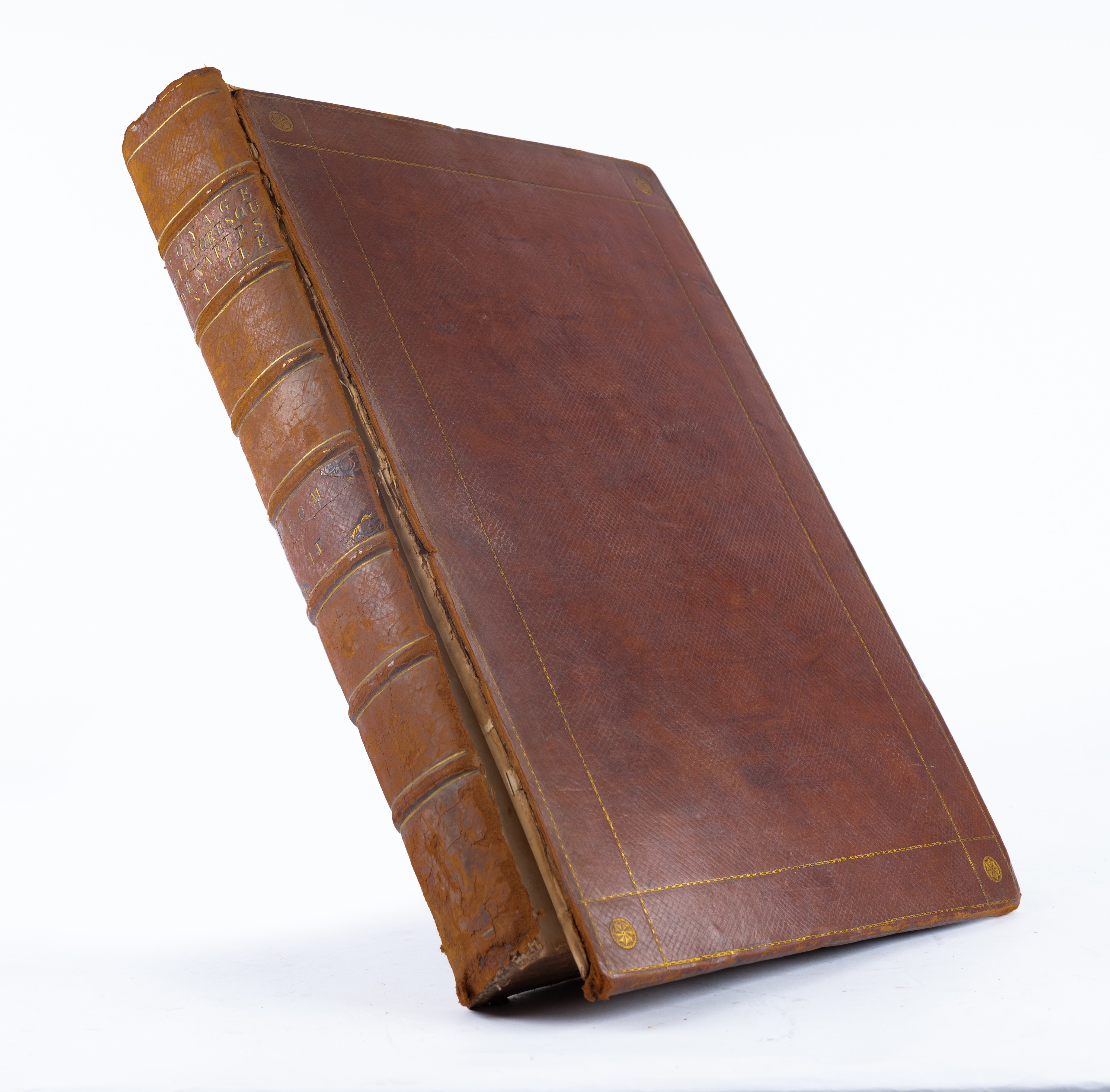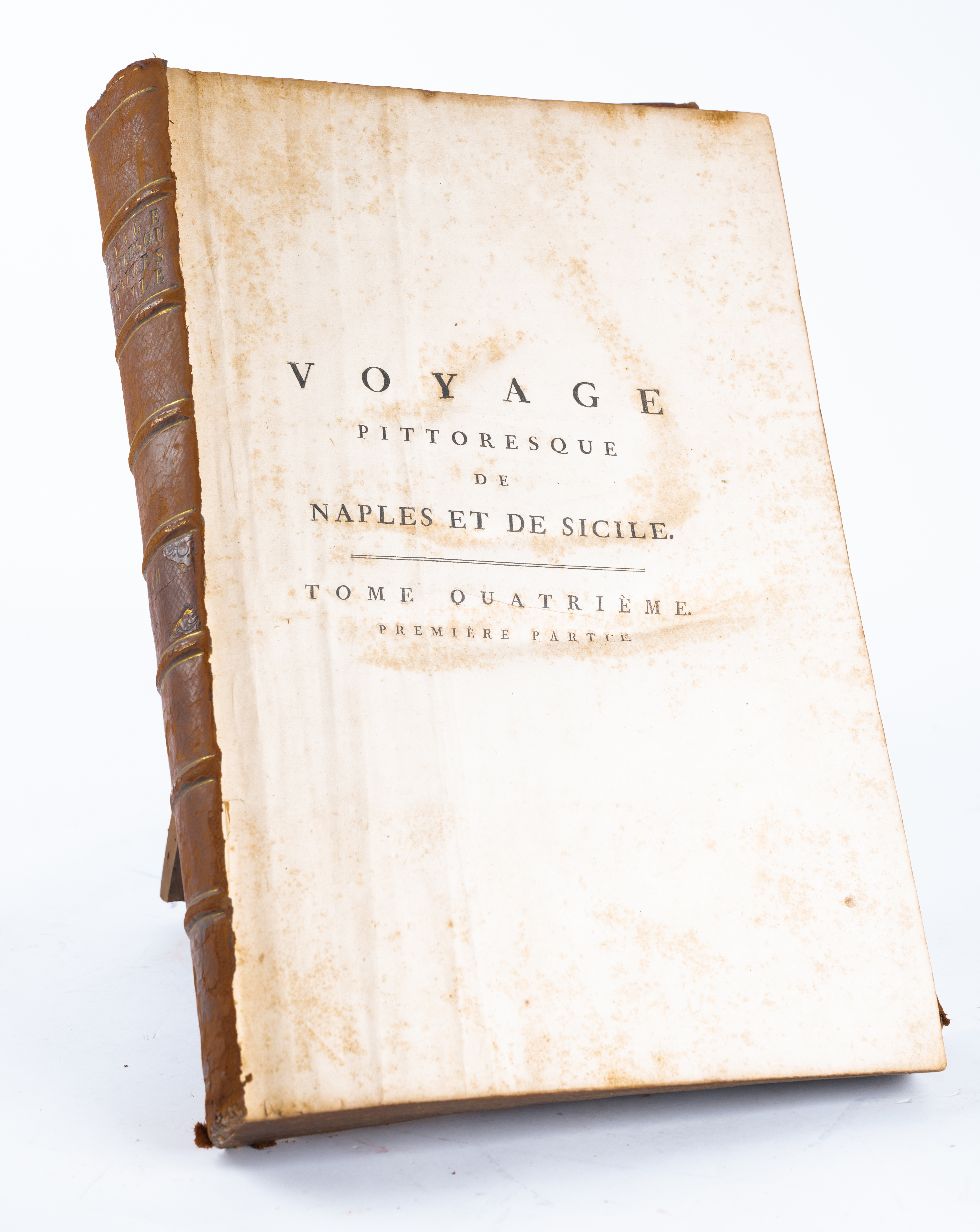 Saint-Non, Jean Claude Richard, de. VOYAGE PITTORESQUE OU DESCRIPTION DES ROYAUMES DE NAPLES ET DE SICILE. QUATRIÈME VOLUME CONTENANT LA DESCRIPTION DE LA SICIL, a Paris, 1785. Volume IV di quattro. Volume magnifico e considerata uno dei più celebri volumi illustrati del settecento. 1^ edizione, in imponente legatura editoriale con piatti in legno foderati di piena pelle con nervature, titoli e fregi impressi in oro al dorso. piatti slegati. Jean-Claude Richard de Saint-Non, meglio noto come Abate di Saint-Non, o Abbé de Saint-Non (1727- 1791), è stato un incisore, disegnatore, umanista, nonché archeologo, mecenate e viaggiatore francese. Tra il 1759 e il 1761 visitò l'Inghilterra e successivamente l’Italia, dove strinse amicizia con il pittore Jean-Honoré Fragonard e Hubert Robert, di cui divenne il mecenate. Viaggiò con loro in Sicilia e a Napoli e, al suo ritorno, iniziò a pubblicare il Voyage Pittoresque, che fu arricchito da oltre cinquecento tavole e vignette incise dai migliori artisti dell’epoca (tra cui Charles-Nicolas Cochin, Pierre-Philippe Choffard, Heinrich Guttenberg, Joseph de Longueil) a partire dai propri disegni, da quelli di Clément-Pierre Marillier e di Claude-Louis Châtelet, (valente pittore a cui Maria Antonietta era particolarmente affezionata), e dai disegni dei suoi compagni di viaggio. Volume in folio grande (cm 49,5 x 32,5 ). Pp. [VI] XVIII [4], 430 (tra prima e seconda parte in numerazione continuativa), con 140 tavole. Opera collazionata; completa di tutte le pagine e le tavole originali dell’opera. Vignetta calcografica sul frontespizio disegnata da Jean Honoré Fragonard e incisa da Augustin de Saint-Aubin. Ex libris di Charles Barclays e Massimiliano d’Orello.