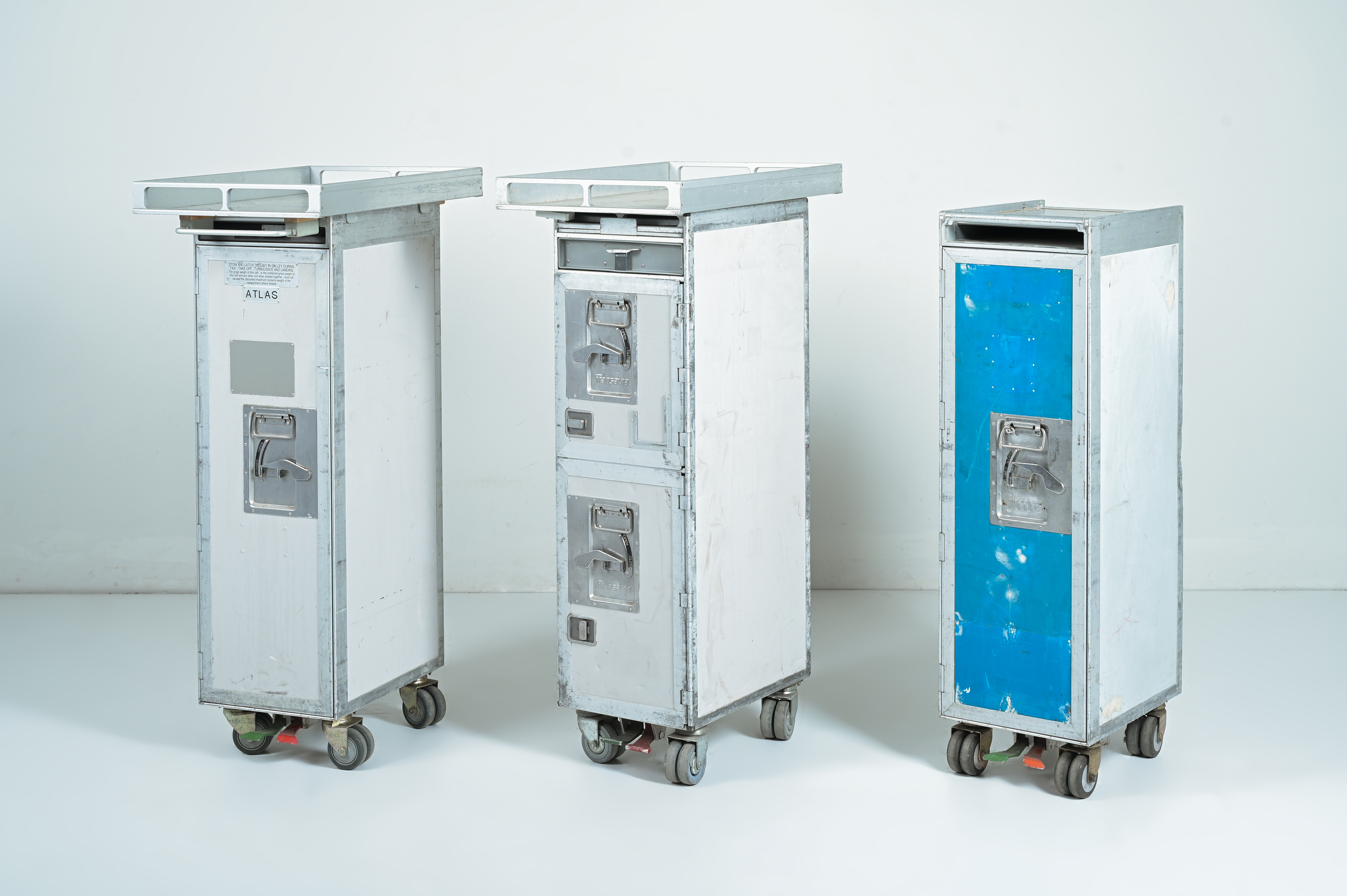 Una cucina realizzata con parte di aereo Boeing 737, lavello interrato Smeg, miscelatore, carrelli da servizio a bordo, parte di finestrini passeggero, cantina frigo, 10 contenitori Atlas. Segni di uso.