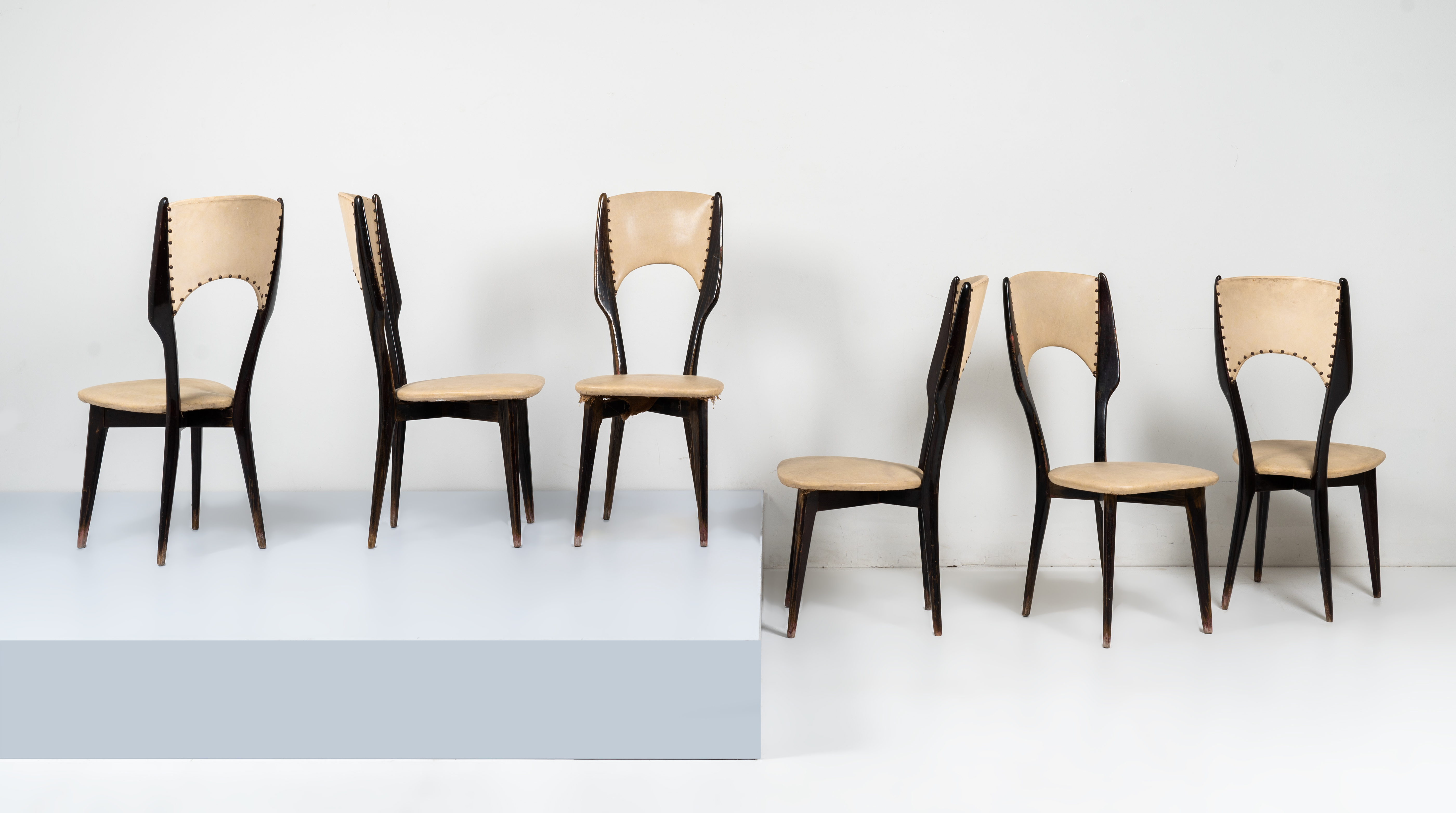 Sei sedie con struttura in legno ebanizzato, spalliera con fianchi sagomati, seduta e spalliera con imbottitura e rivestimento in skai avorio. Difetti e segni di uso.