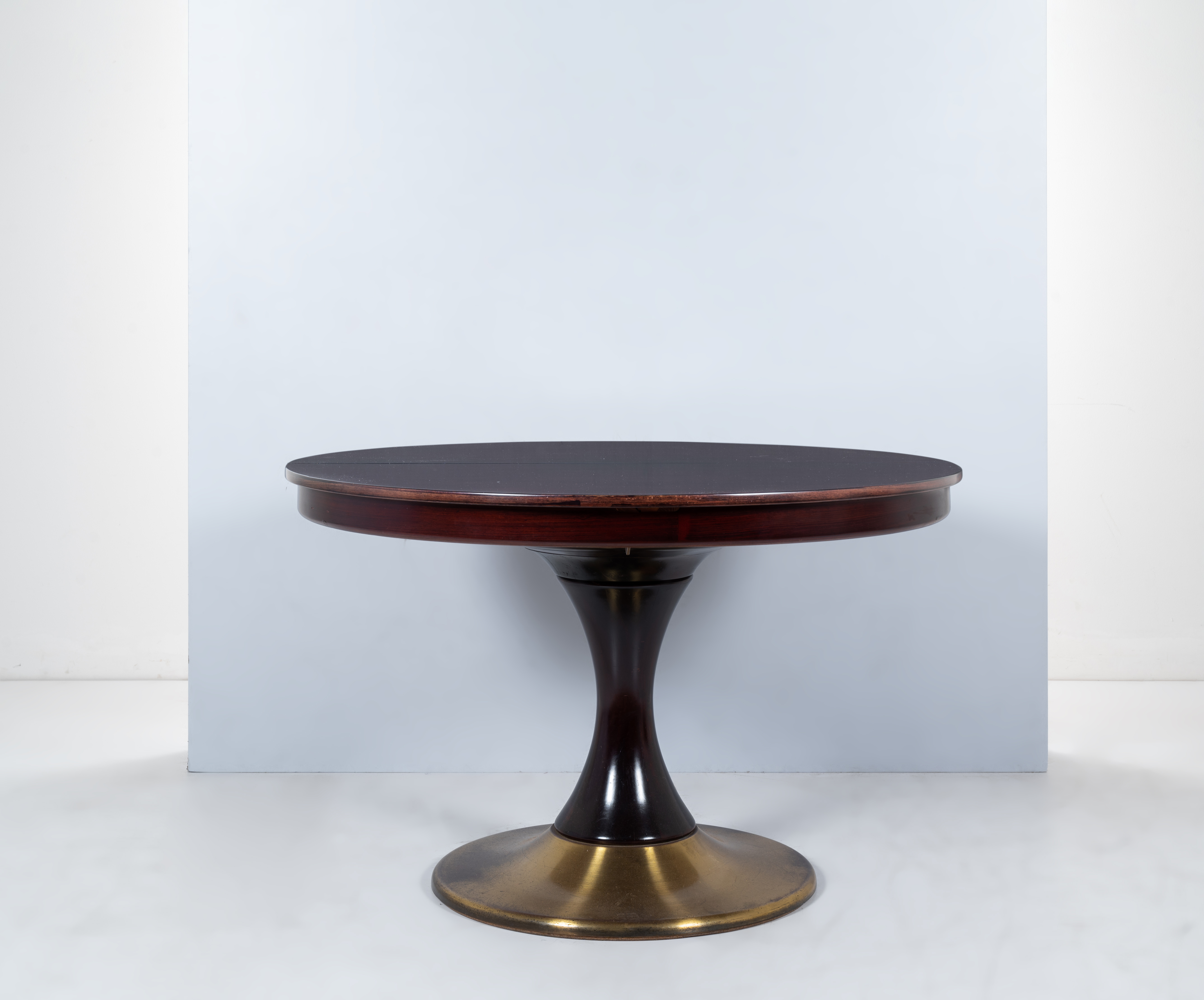 Tavolo da pranzo in legno esotico con piano circolare allungabile, sostegno centrale tornito e base rivestita in metallo dorato.
