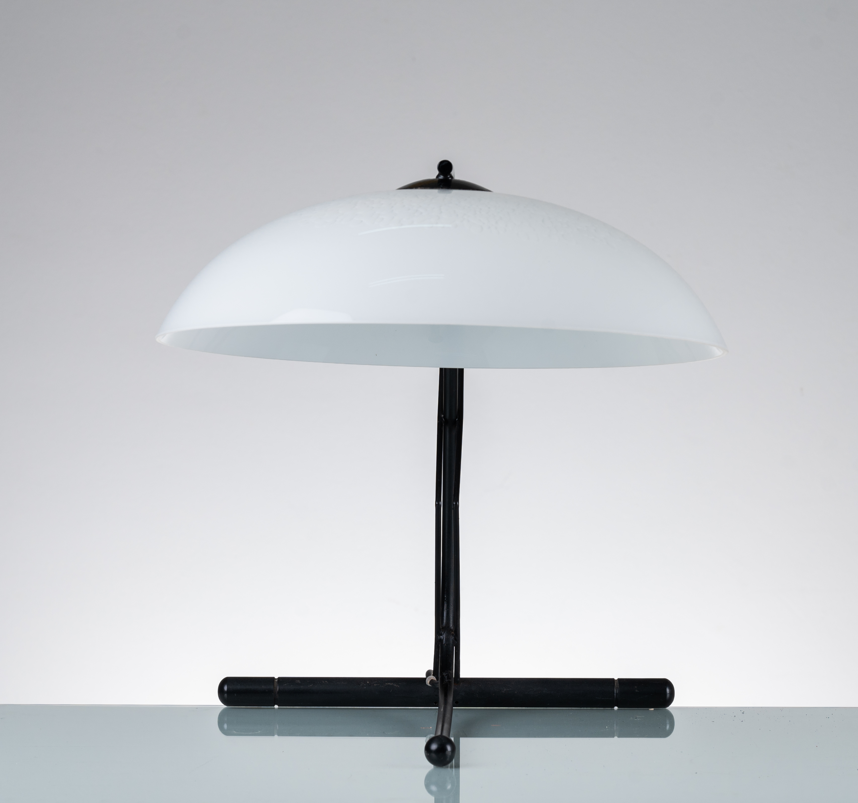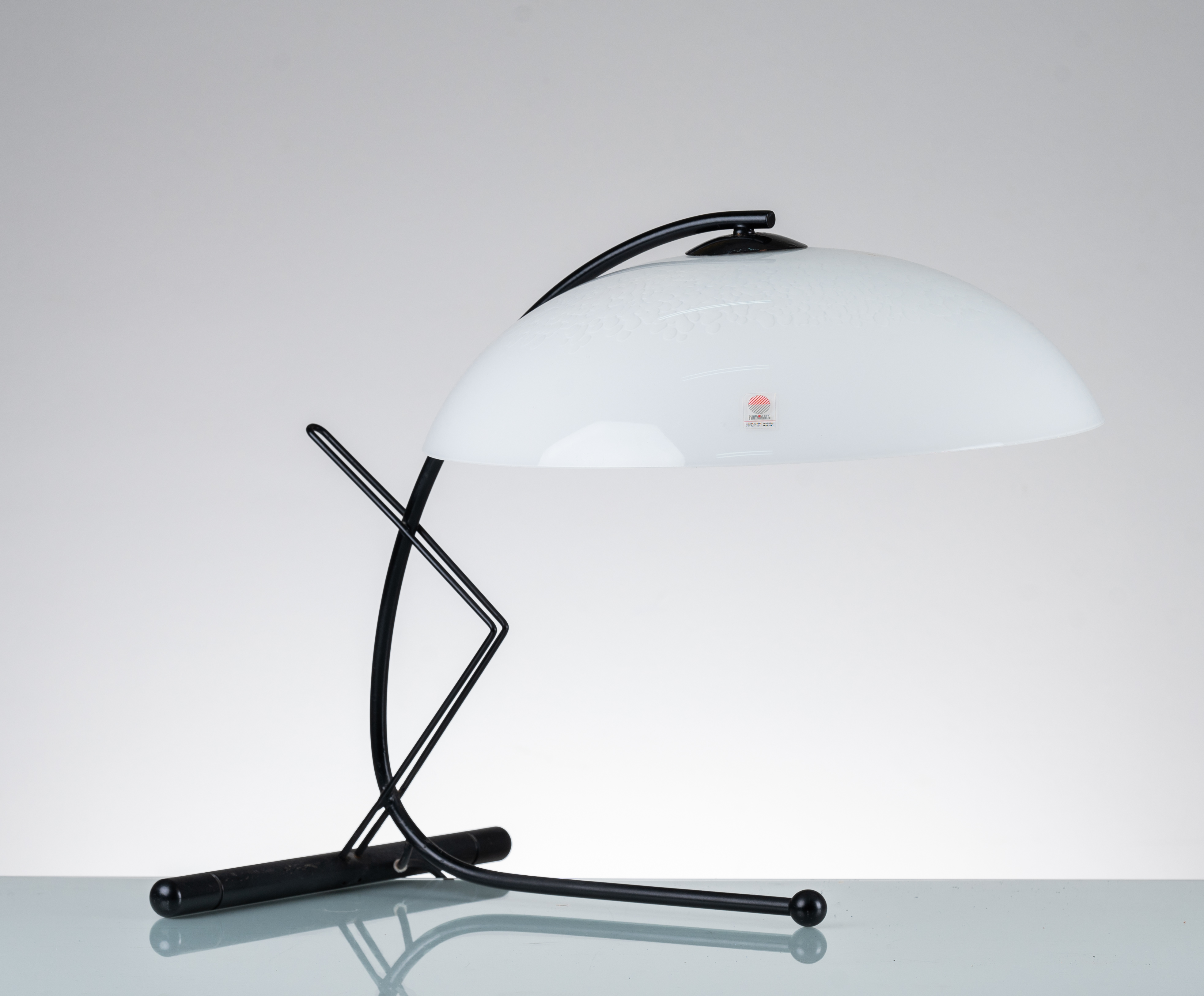 Lampada da tavolo ad una luce, struttura in metallo verniciato nero, diffusore semi sferico a disco in vetro laguna lattimo. Etichetta di produzione.