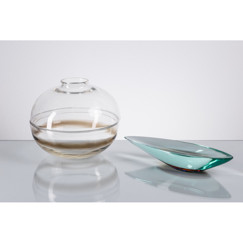Svuotatasche in vetro di forte spessore verde nilo con fondo colorato, corpo ellittico. Un vaso globulare a due semisfere trasparente con larga fascia marrone scuro sulla parte inferiore, (sbeccature).