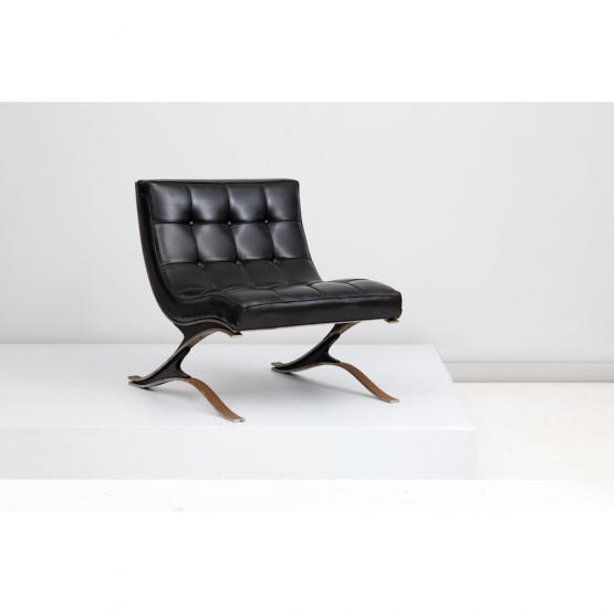 Coppia di poltrone in tubolare di acciaio, seduta e spalliera con imbottitura e rivestimento in pelle nei toni marrone.