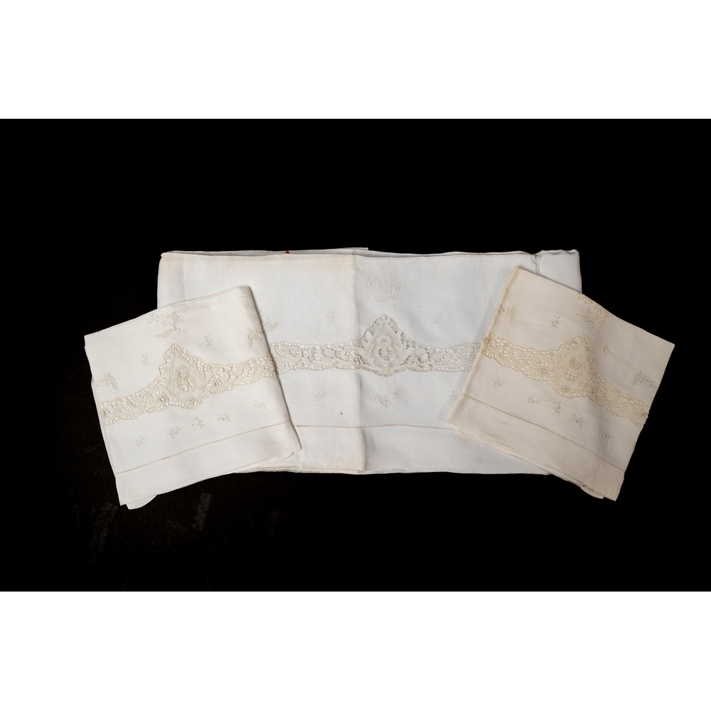 LENZUOLO matrimoniale e due federe in lino con ricami a mano nei toni del bianco (macchie).