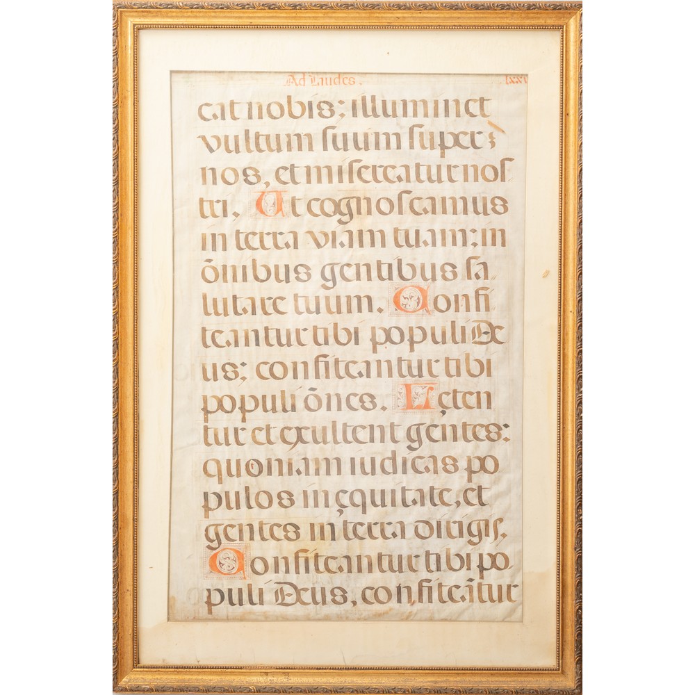 PAGINA A STAMPA DI ANTIFONARIO DEL XVIII SECOLO. Cornice lignea novecentesca. Lettere iniziali finemente decorate e riproducenti lo stile manoscritto. In perfette condizioni di conservazione. Dimensioni della pagina cm 72 x 48.