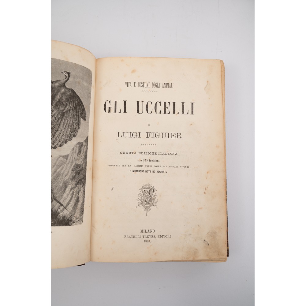 NOVE VOLUMI DI STORIA NATURALE: 1) George Louis Leclerc Conte di Buffon STORIA NATURALE GENERALE E PARTICOLARE DEGLI UCCELLI, ed. Napoli Presso i Fratelli Raimondi 1777 – 1791. In 8 volumi in 16°. Rilegature in mezza pelle con piatti marmorizzati e titoli e fregi in oro ai dorsi. Iniziali di appartenenza in oro ai dorsi. Ogni volume è corredato delle tavole in b/n f. t. in fine. I volumi risultano leggermente rifilati. Sporadiche gore e fioriture. Pp. (2), 316, XII t.; (2), 307, XVII t.; (2), 336, IX t.; V, 328, XVIII t.; (4), 364, XIX t.; (4), 312, XII t.; 338, VI, XII t.; 336, xxxvj, XII t. 2) Luigi Figuier GLI UCCELLI, ed. Milano, Fratelli Treves 1881. In 8°. Rilegatura novecentesca in mezza pelle con piatti marmorizzati, titoli entro tassello al dorso, filetti, fregi dorati e nervature al dorso. Alcune macchie e fioriture alle pagine. Pp.XI, 551 con 348 incisioni n.t. e incisione a tutta pagina in antiporta. € 160,00. Valutazione € 380,00.