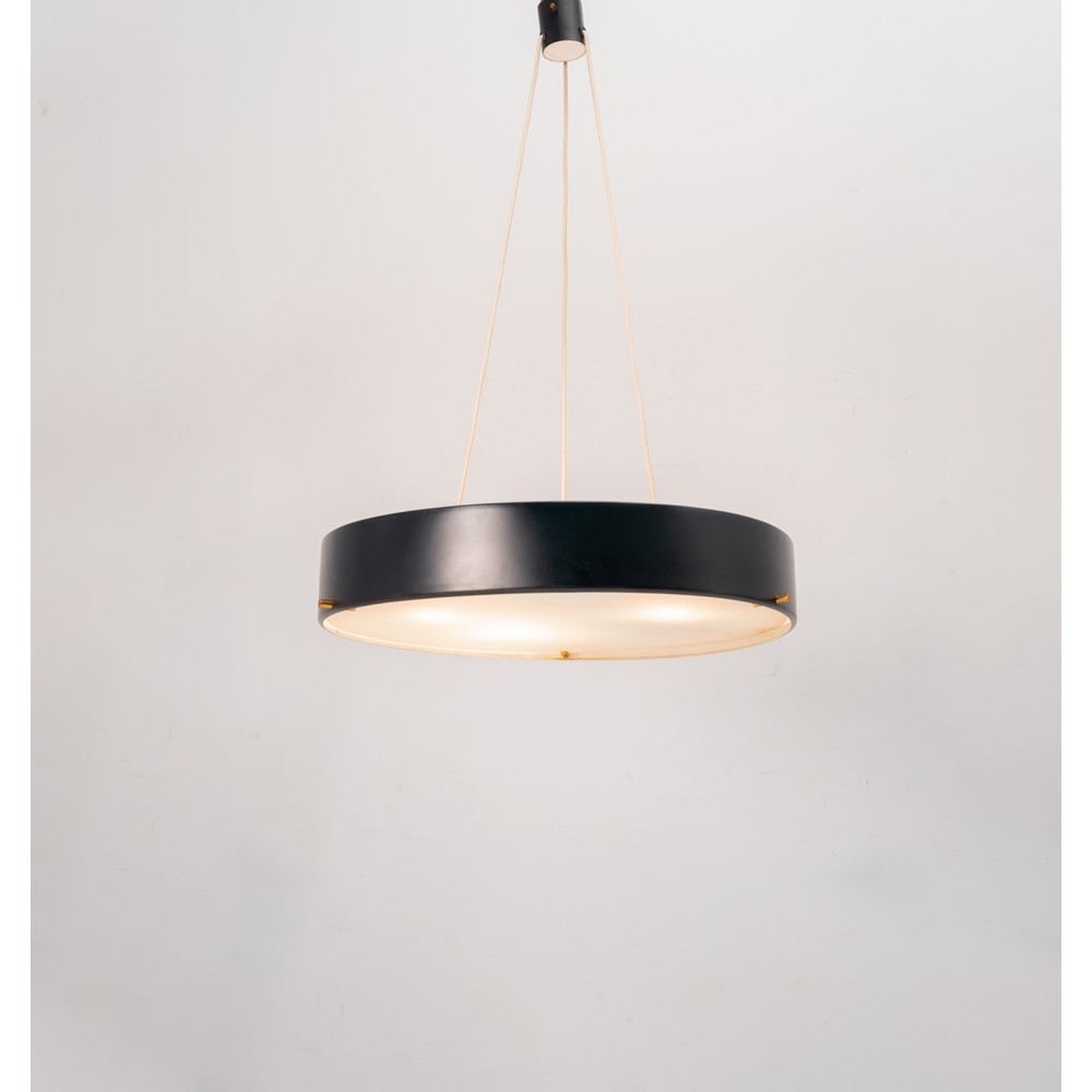 Lampada a sospensione modello “1090” a sei luci, diffusore luminoso circolare in alluminio verniciato nero, ottone, vetro opale.