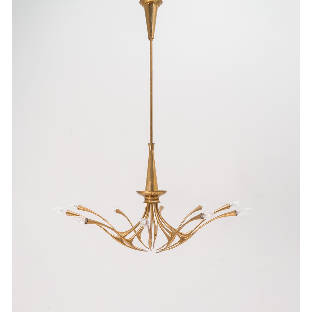 Lampada a sospensione ad dieci luci con struttura e diffusori in ottone.