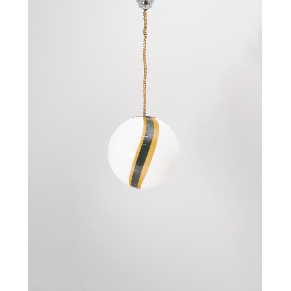 Lampada a sospensione ad una luce con diffusore sferico in vetro lattimo e decorato con murrina a nastro verde.