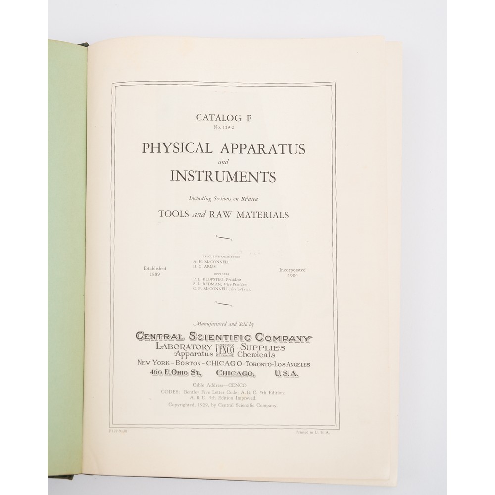 PHYSICAL APPARATUS AND INSTRUMENTS. CATALOG N°129 -2, ed. Central Scientific Company, Chicago 1923. Uno dei cataloghi più completi di strumenti scientifici emessi poco prima della Grande Depressione iniziata nello stesso anno. Sia Bakken che Hagley sono tra le 8 istituzioni scientifiche che ne hanno copie. L'editore iniziò a sviluppare questi articoli nel 1923 e qui ha introdotto quasi tutte le novità e ha migliorato i design che non erano disponibili nei numeri precedenti. Mentre molti degli oggetti qui raffigurati sono disponibili solo sul mercato dei collezionisti, le centinaia di fotografie e descrizioni aiutano a vedere i tipi di strumenti scientifici speciali che erano disponibili nella prima parte del 20° secolo. Bella legatura editoriale in percallina rigida con piatti e dorso con titoli e decorazioni a effetto bronzo. In ottime condizioni. Pp. 601.