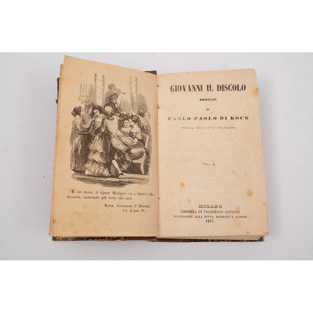 SETTE VOLUMI DI LETTERATURA E ROMANZI DEL XIX SECOLO: 1) Luigi Coppola POESIE GIOCOSE SATIRICHE E D’AMORE, ed. Napoli, Chiurazzi 1879. In 24°. Rilegatura rigida muta. Pp. 240. 2) Walter Scott GUIDO MANNERING O SIA L’ASTROLOGO, ed. Milano, Vincenzo Ferrario 1824. Volgarizzato dal Professor Gaetano Barbieri. 2 volumi in 16°. Rilegature coeve in mezza pelle con piatti cartonati. Tagli colorati. Pp. 336; 364. 3) Walter Scott REDGAUNTLET, ed. Napoli, Marotta e Vanspandoch 1829. Volgarizzato dal Professor Gaetano Barbieri. due tomi in unico volume. In 16°. Rilegature coeve in tela rigida Tagli spruzzati. Pp. 285; 232. 4) Giuseppe Mazzini I FRATELLI BANDIERA - DANTE – FILOSOFIA DELLA MUSICA, ed. Milano, Sonzogno 1883. In 16°. Rilegatura in percallina rigida con titoli, fregi e segni di appartenenza in oro al dorso. 5) Carlo Paolo di Kock GIOVANNI IL DISCOLO, ed. Milano, Francesco Sanvito 1857. In 16°. Rilegatura in mezza tela con piatti marmorizzati. Tre tomi in unico volume. Pp. 165, 159, 183 con 3 tavole f. t. 7) Salvatore Romano VOCI E MANIERE DI DIRE SICILIANE – ITALIANE, Palermo Remo Sandron 1873. In 16°. Rilegatura muta con dorso slegato ma presente. Pp. 127, 144, 208.