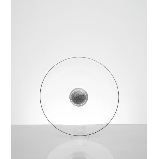 Grande centrotavola circolare in vetro trasparente bordato di nero. Base nera. Imballaggio originale.