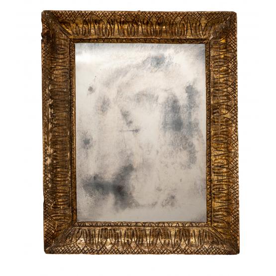 SPECCHIERA di gusto settecentesco in legno intagliato e dorato ad argento a mecca.