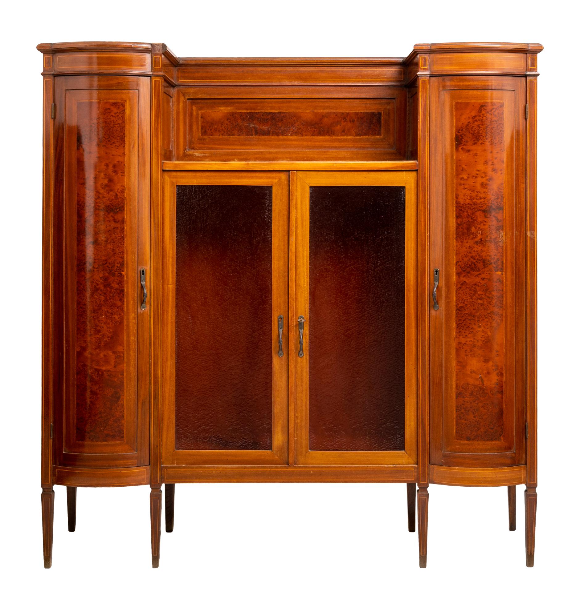 STUDIO composto da scrivania a fagiolo con piano in cuoio e 7 cassetti, libreria a 4 ante, poltrona e 3 sedie, in legno di mogano.