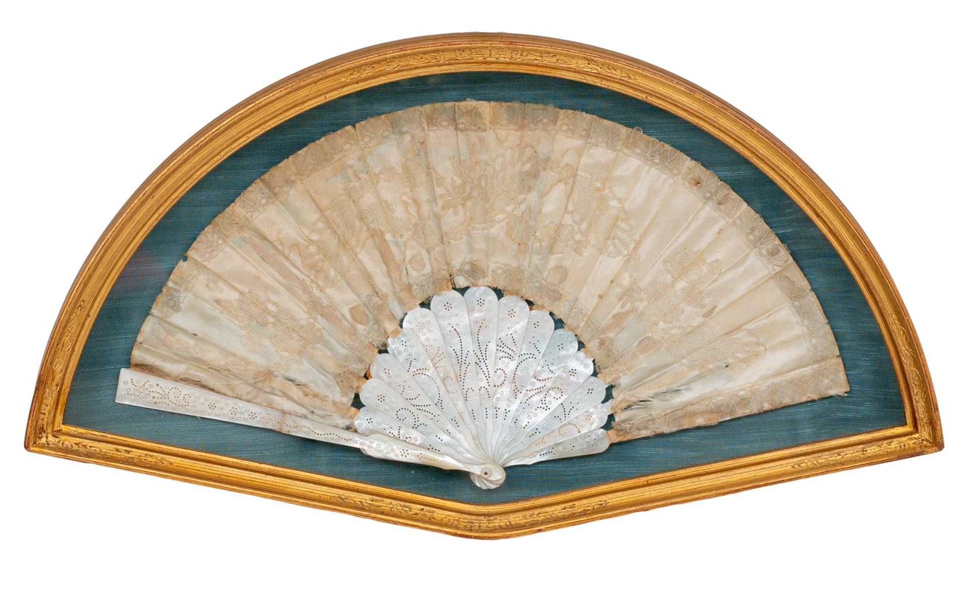 Ventaglio con stecche in madreperla, pagina in seta entro ventagliera.