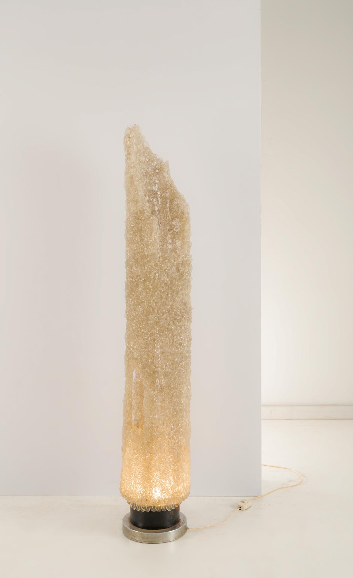 Lampada da terra ad una luce in resina trasparente, corpo cilindrico, base circolare in metallo cromato e verniciato nero.