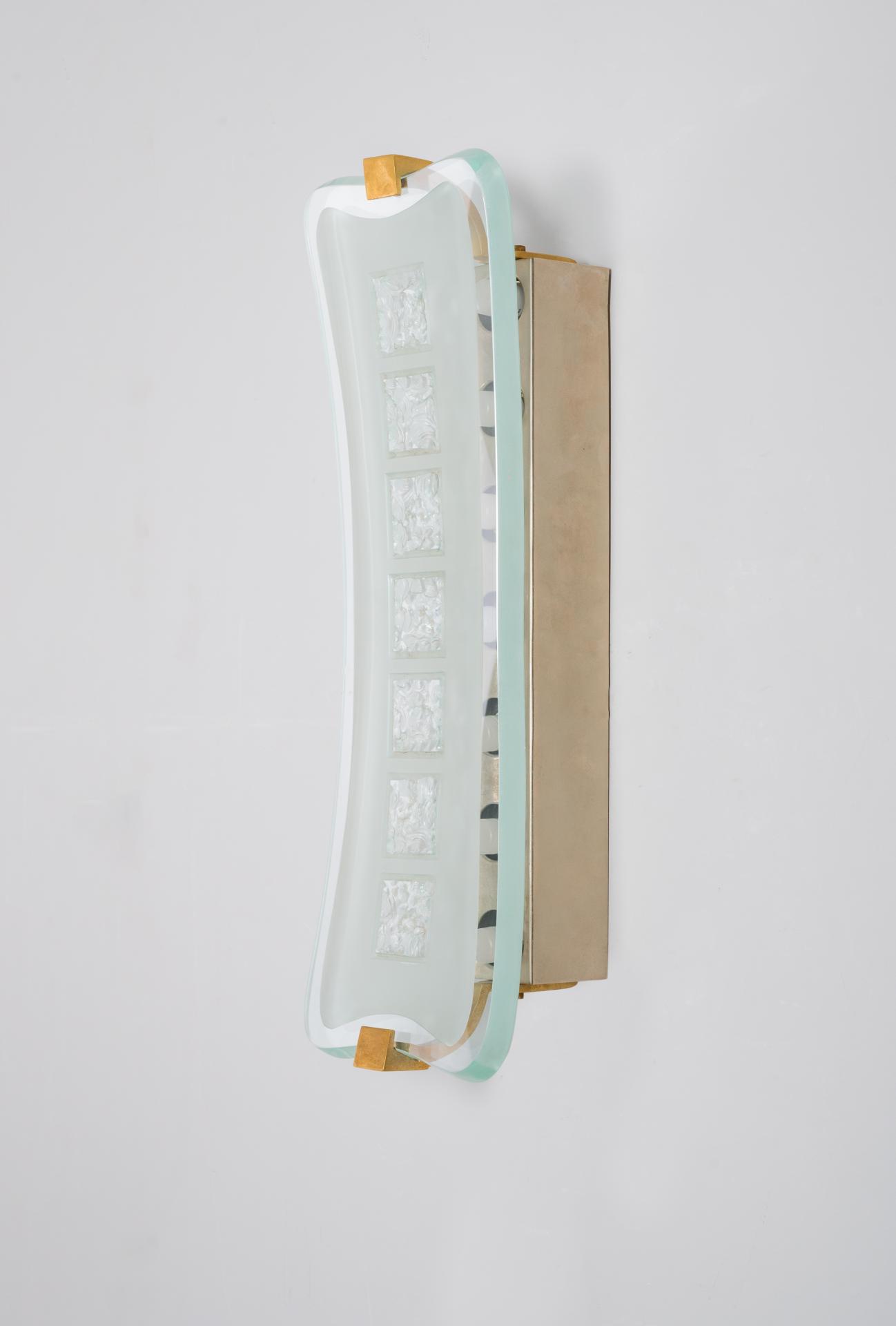 Lampada da parete a sette luci modello “1568”. Diffusore in cristallo curvato satinato con riquadri scalpellati. Montatura in ottone nichelato lucido.