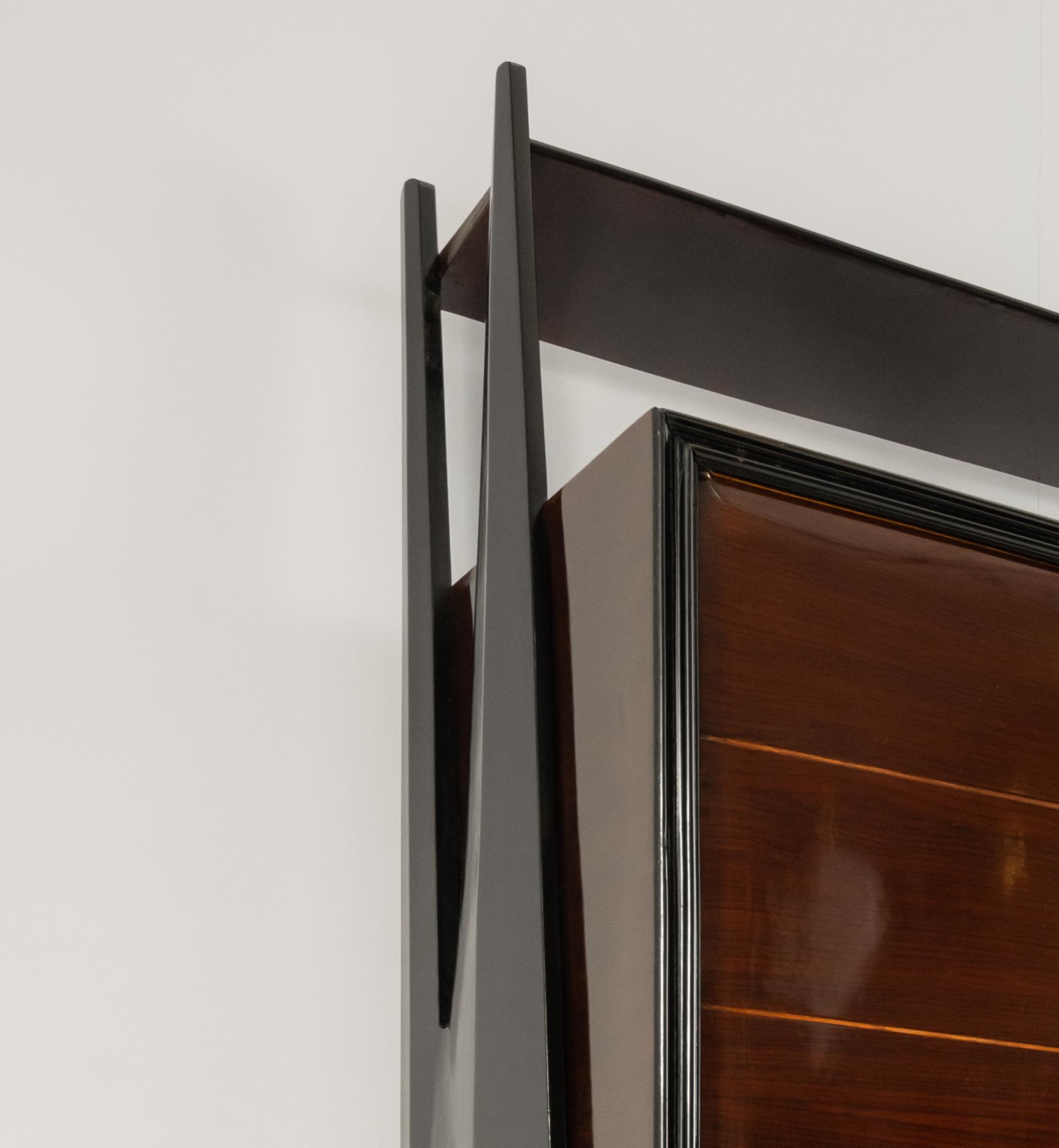 Mobile contenitore in legno scuro ed ebanizzato composto da un vano chiuso a ripiani con due ante battenti e un piano soprastante a giorno, sul fronte decoro a fasce e maniglie in ottone, sui fianchi i piedi salgono sui fianchi fino al piano a giorno.