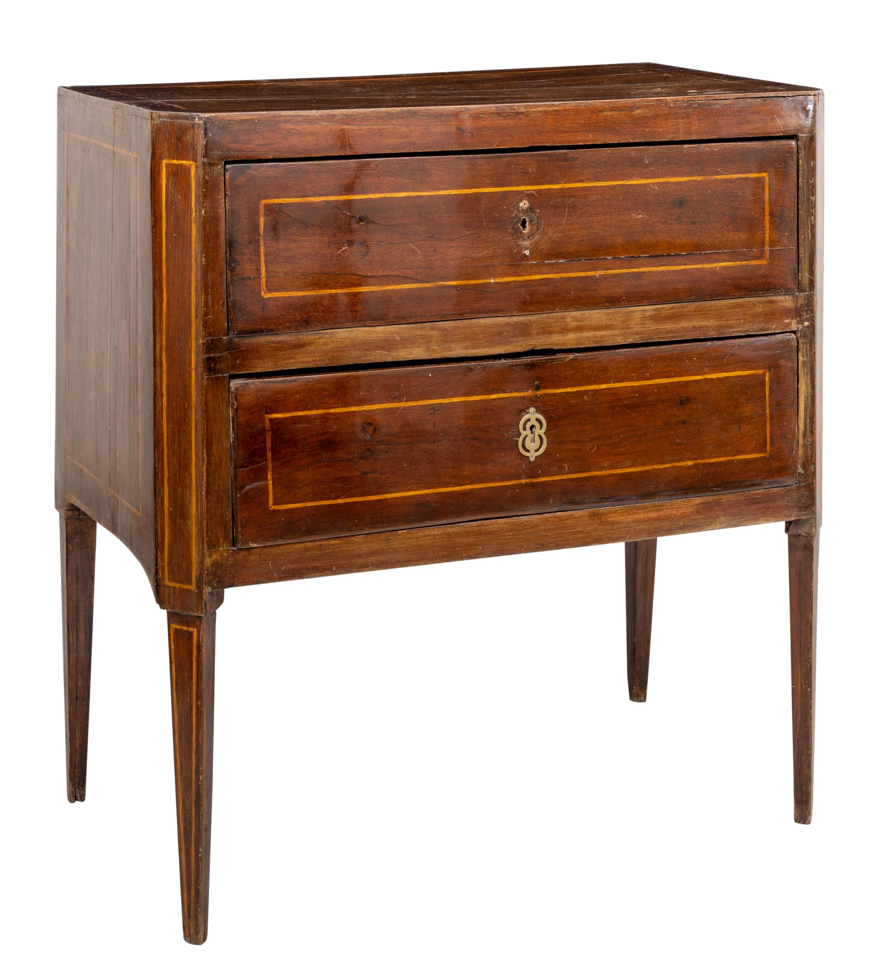 Cassettone stile Luigi XVI a due cassetti in legno di noce e perfili in bosso.