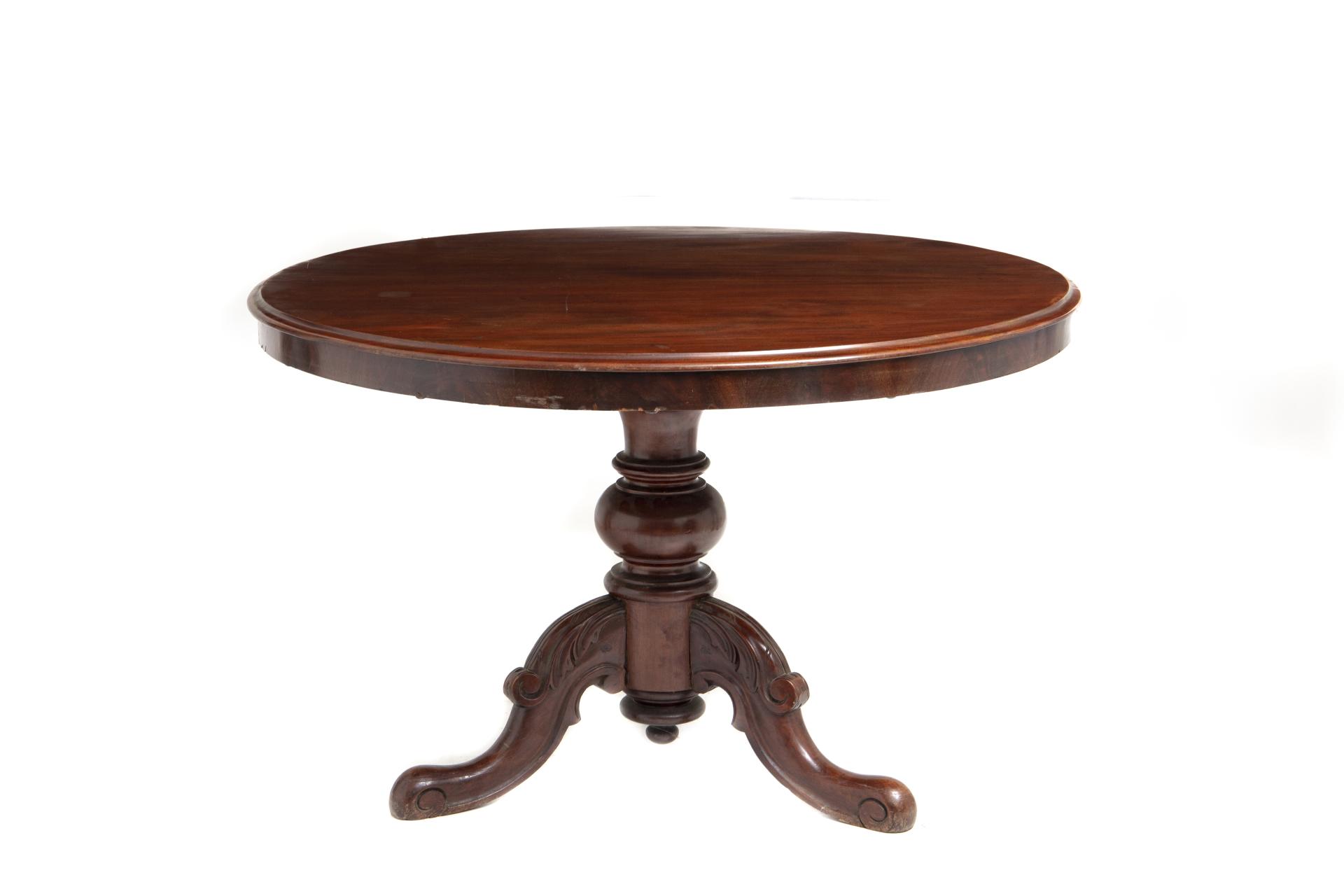 TAVOLO di forma circolare in legno di mogano, fusto a colonna e piede tripode e sei sedie.