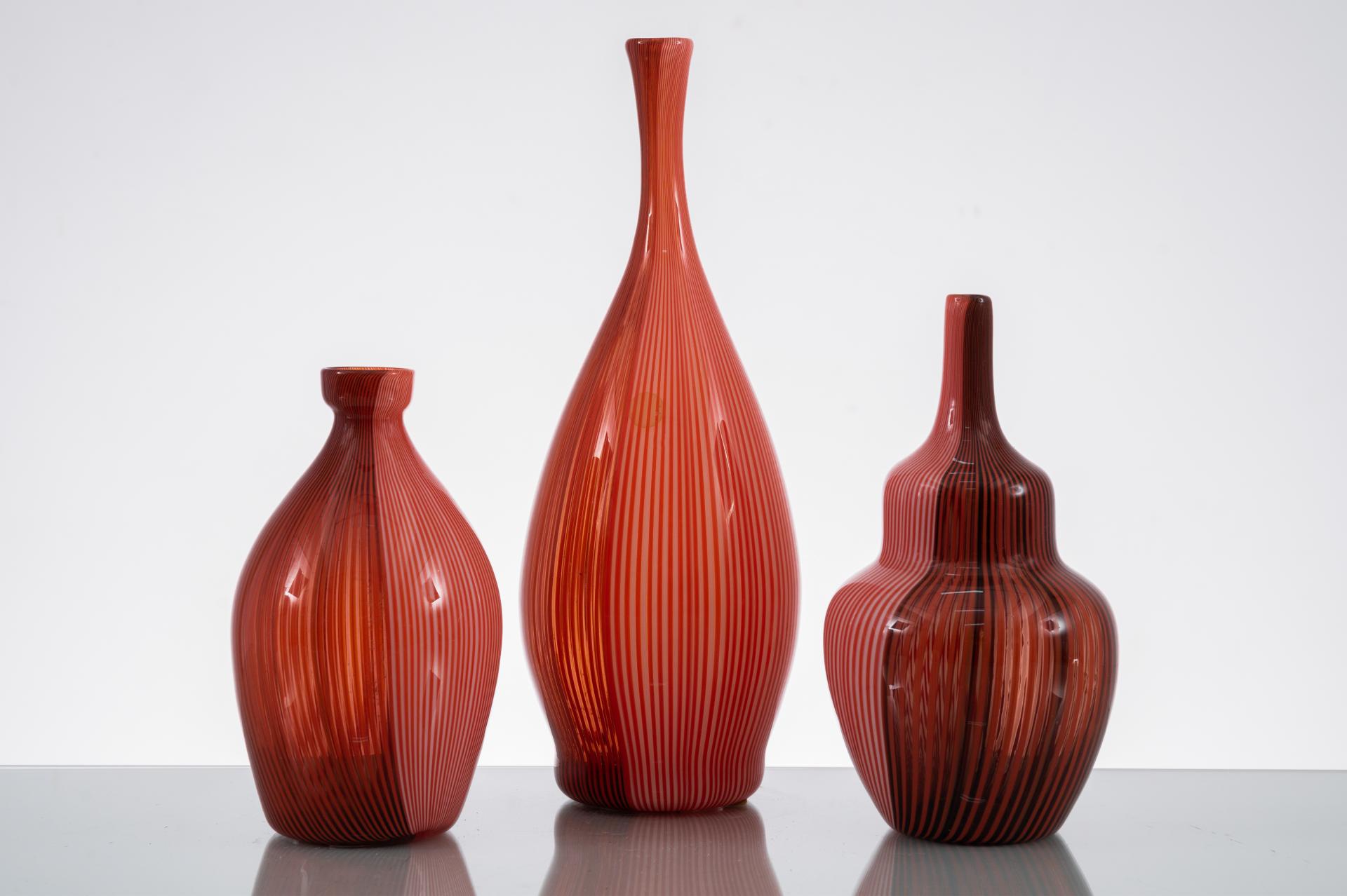 Collezione completa di tre vasi della serie “Tessuti” in vetro soffiato con decoro di canne corallo e nero con superficie interamente battuta, uno con corpo a bottiglia, lungo collo e bocca piana circolare; uno con corpo ovalizzato a due movimenti, collo lungo e stretto, bocca piana circolare; uno con corpo ovalizzato, basso collo, bocca lievemente spessita e piana. Firma a punta Venini, Carlo Scarpa, 1984-1987-1988.