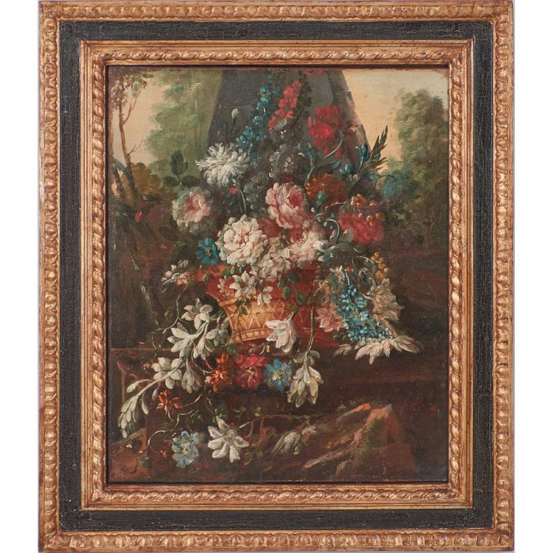 Olio su tela "Natura morta" entro cornice in legno dorato ed ebanizzato.