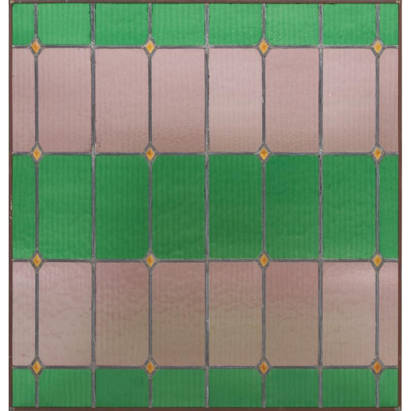 Vetrata a piombo composta da rettangoli in vetro cattedrale nei toni del verde e del ruggine, piccoli inserti in vetro sfaccettato nei toni ambra.