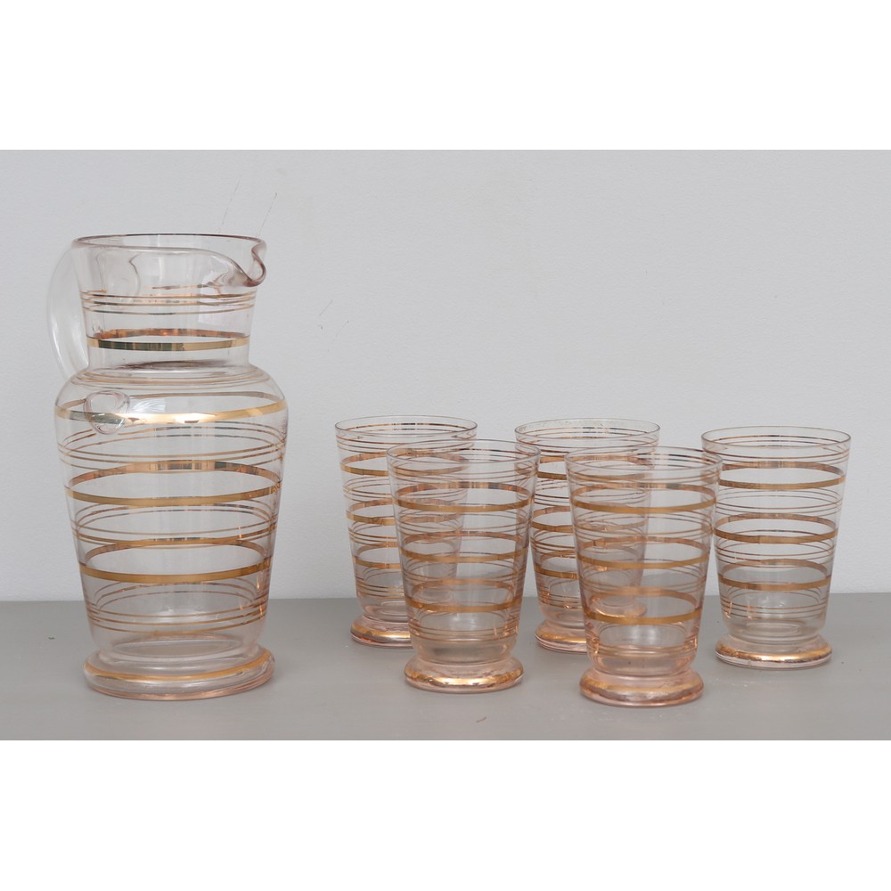 BROCCA CON 5 BICCHIERI Decò in vetro colorato rosa con lumeggiature circolari in oro.