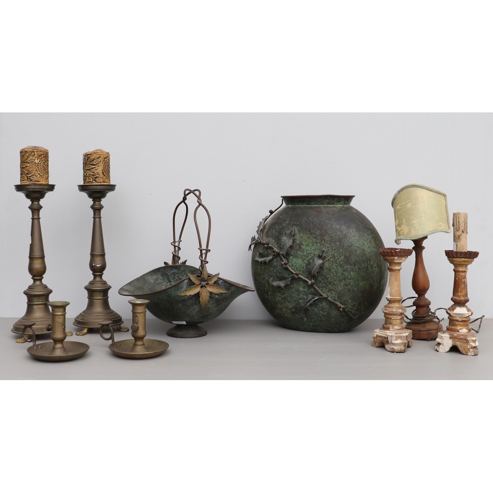 Due candelieri, due bugie, cestino e vaso in ottone e candelieri di diversa tipologia in legno.