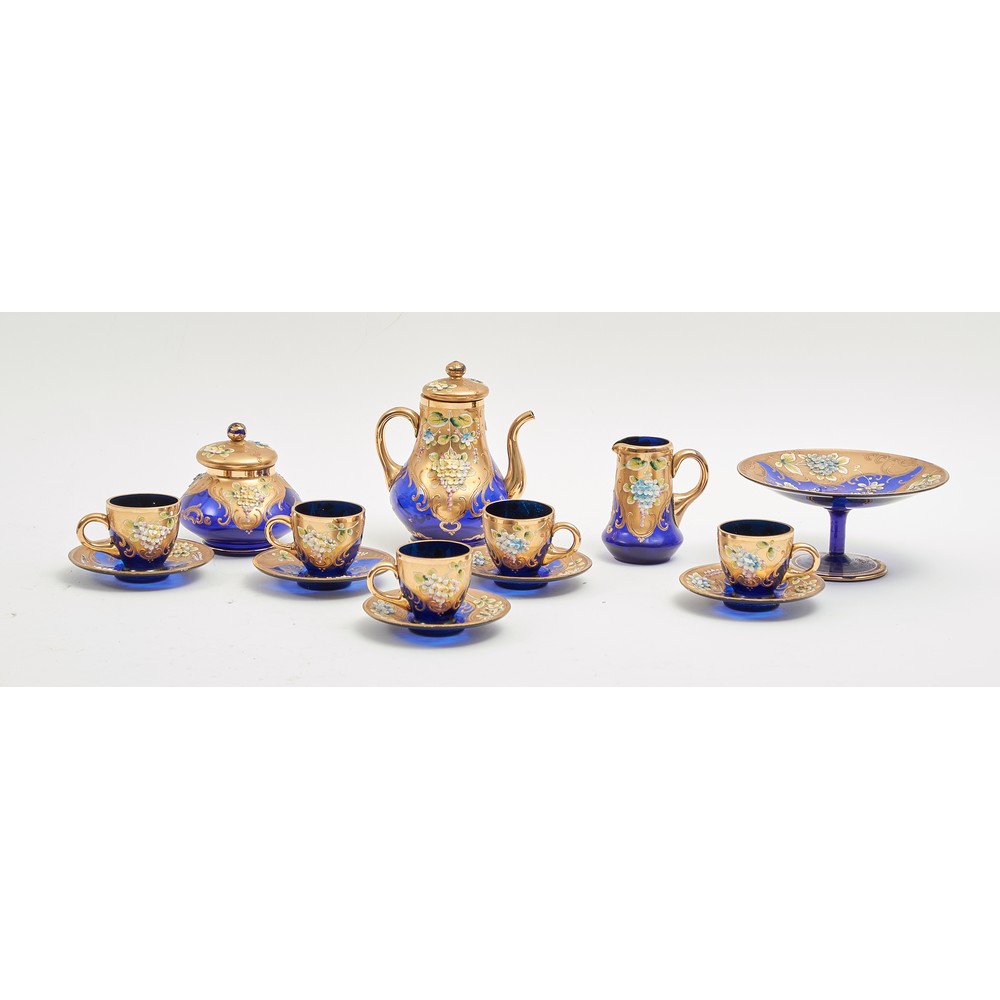 SERVIZIO DA CAFFE' in vetro di murano blu e lumeggiature in oro composto da: alzatina, caffettiera, lattiera, zuccheriera e cinque tazzine con piattini (sbeccature).