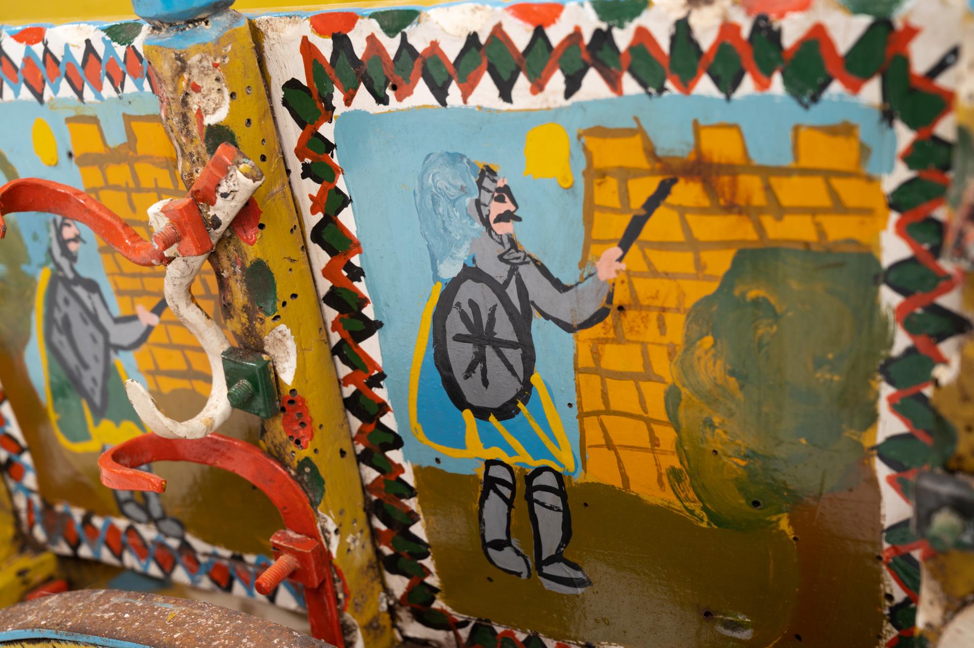Carrettino siciliano in legno scolpito e dipinto a mano.