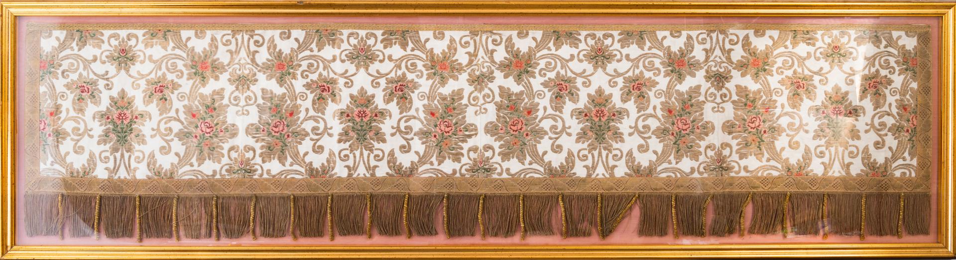 Elemento Sacro in tessuto d'altare ricamato a filo d'oro, entro cornice.