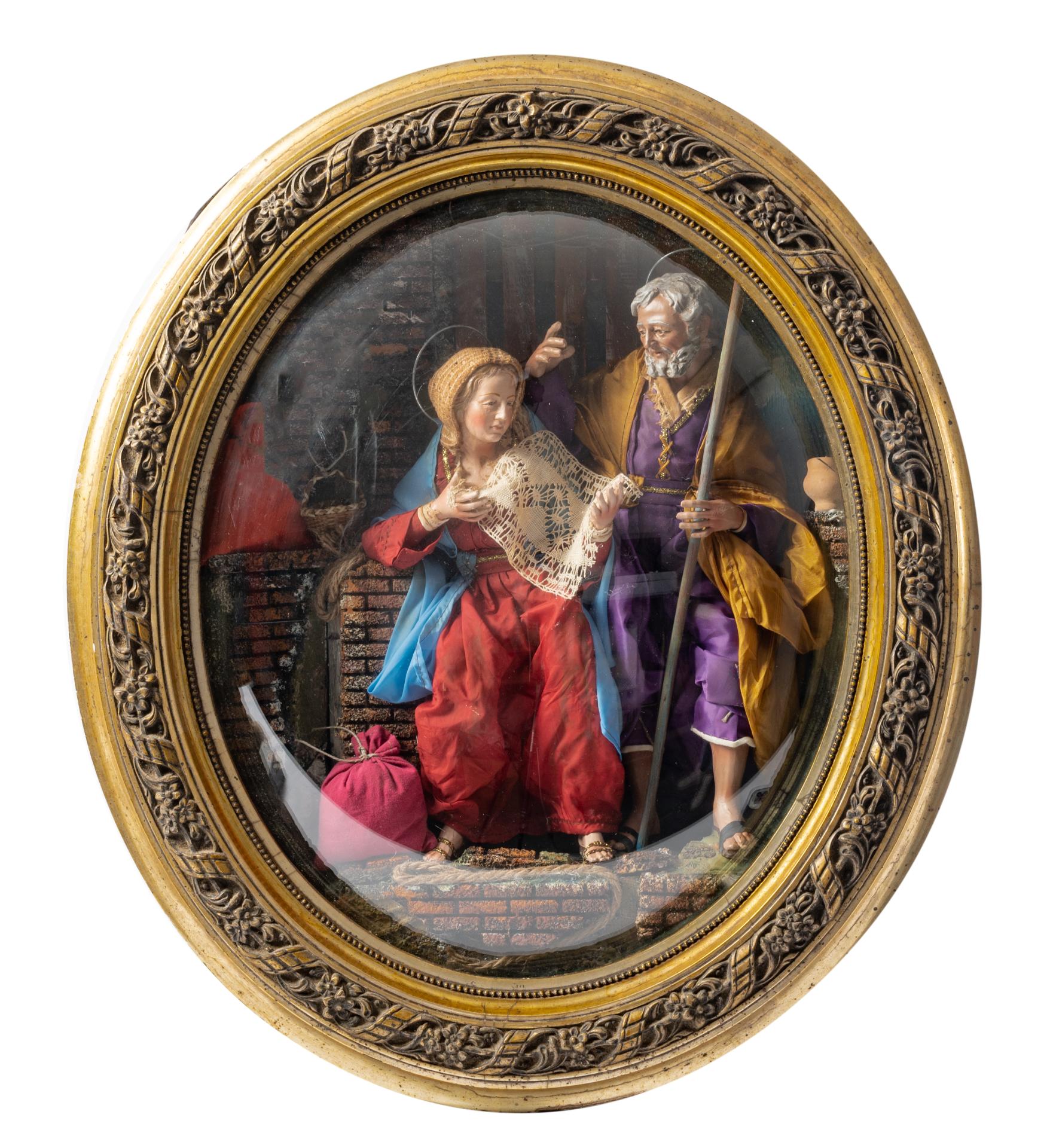 Composizione in terracotta policroma raffigurante "Sacra Famiglia" entro teca di forma ovalizzata con cornice in legno e pastiglia ad argento a mecca.
