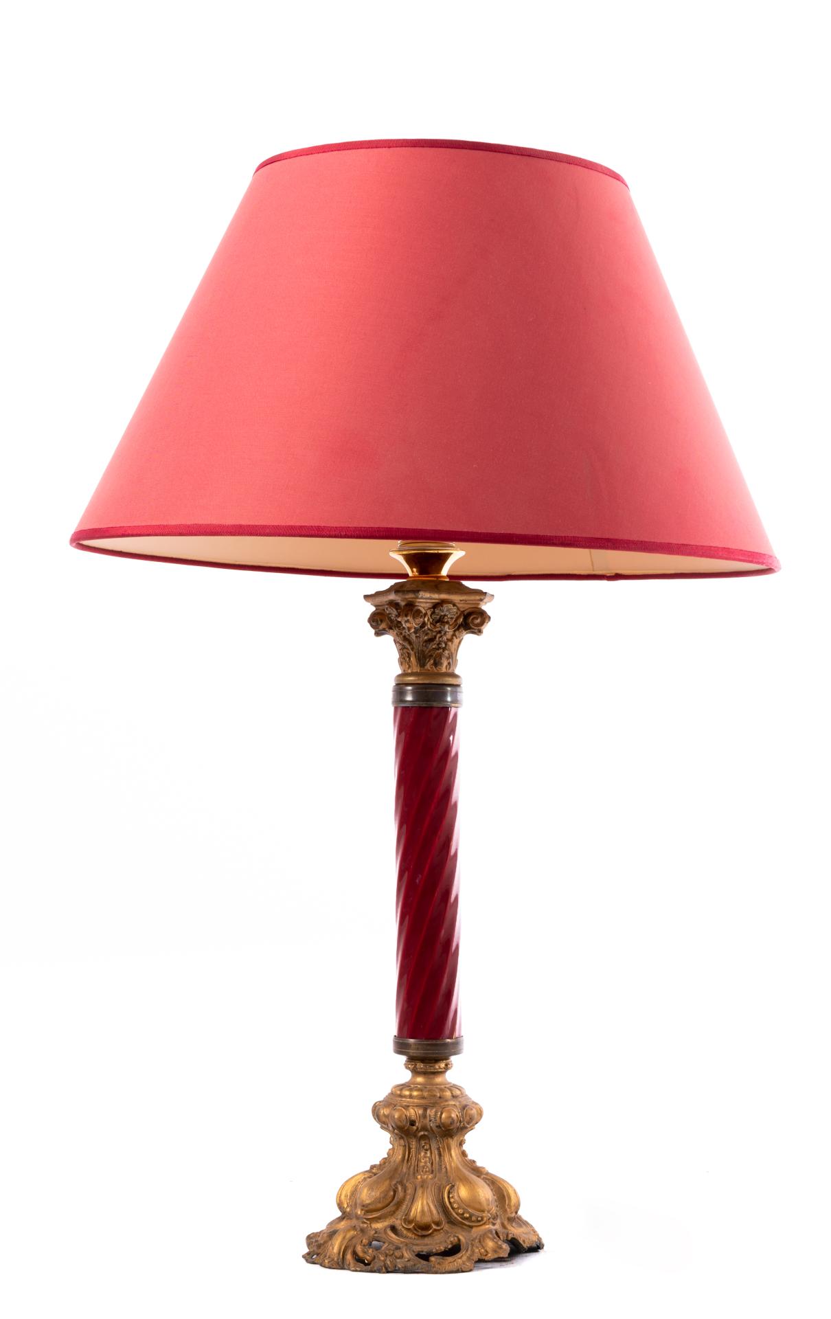 LUME da tavolo in ceramica smaltata nei toni del rosso con base in bronzo dorato e paralume.
