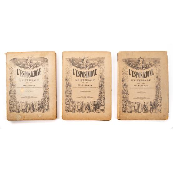 TRE VOLUMI DELLA ESPOSIZIONE UNIVERSALE DEL 1867: AA. VV. L’ESPOSIZIONE UNIVERSALE DEL 1867 ILLUSTRATA. PUBBLICAZIONE INTERNAZIONALE AUTORIZZATA DALLA COMMISSIONE IMPERIALE, ed. Milano, Edoardo Sonzogno 1867. Opera completa dei 120 fascicoli. In 3 volumi in folio, (cm 38 x 28,5). Legatura editoriale in cartonato illustrato. Dorsi assenti. Edizione italiana di questa pubblicazione uscita in 120 dispense durante l'esposizione universale del 1867 svoltasi a Parigi tra l'aprile e il novembre 1867. Pp. (4), 320; (4), da 321 a 640; (4), da 641 a 960, IV, con moltissime illustrazioni anche a piena pagina nel testo. Stampato su tre colonne. Opera rara a trovarsi così completa. Applicati ai fogli di guardia dei volumi ex libris di appartenenza del Conte di Aceto Cattani.