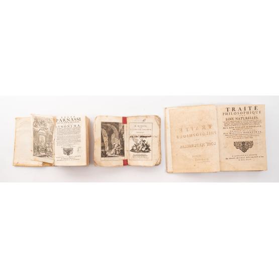 TRE VOLUMI DEL XVIII SECOLO: 1) Richard Cumberland TRAITE’ PHILOSOPHIQUE DES LOIX NATURELLES OU L’ON RECHERCHE ET L’ON ETABLIT PAR LA NATURE DES CHOSES …. PAR LE DOCTEUR RICHARD CUMBERLAND DEPUIS EVEQUE DE PETERBOROUGH TRADUIT DU LATIN PAR MONSIEUR BARBEYRAC …. A Lousanne & a Geneve Chez Marc Michel Bousquet MDCCXLIV. In 8° grande. Legatura in piena pergamena rigida ottocentesca. Titoli in oro entro tassello al dorso. filetti in oro al dorso e decori floreali. Mutila dell’antiporta e pagine brunite dal tempo. Eccezionale e rara edizione svizzera di quest’opera. Pp. XXVIII, 435 (7). 2) IL ROMITO O SIA IL COLPEVOLE RAVVEDUTO. AVVENTURE PIACEVOLI E ISTRUTTIVE, In Venezia MDCCLXX, Presso Angelo Pasinelli. In 8° piccolo. Mutilo della coperta. Antiporta xilografica dell’incisore Zuliani e bella incisione al frontespizio. Testatine, capilettera e finalini incisi. Pagine in ottime condizioni. Tagli marginosi con usure d’uso. Note manoscritte. Rara opera di memorie libertine. Pp. 176. 3) REGIA PARNASSI SEU PALATIUM MUSARUM IN QUO SYNONYMA, EPITHETA, PERIPHRASES, ET PHRASES POETICAE EX OFFICINA TEXTORIS …… AUCTORE P. V. SOC. JESU, Venetiis MDCCXXXV, Ex Typographia Balleoniana. In 8° piccolo. Legatura coeva in piena pergamena con titolo m. s. al dorso. piccola perdita della legatura del dorso alla cuffia. Coperta slegata al dorso. Bellissima antiporta xilografata da Suor Isabella Piccini, particolarmente apprezzata per l'abilità chiaroscurale nella tecnica a bulino. Marca e incipit xilografici. Testo leggermente rifilato. Pagine in perfetto stato di conservazione. Qualche segno d’uso ai piatti.