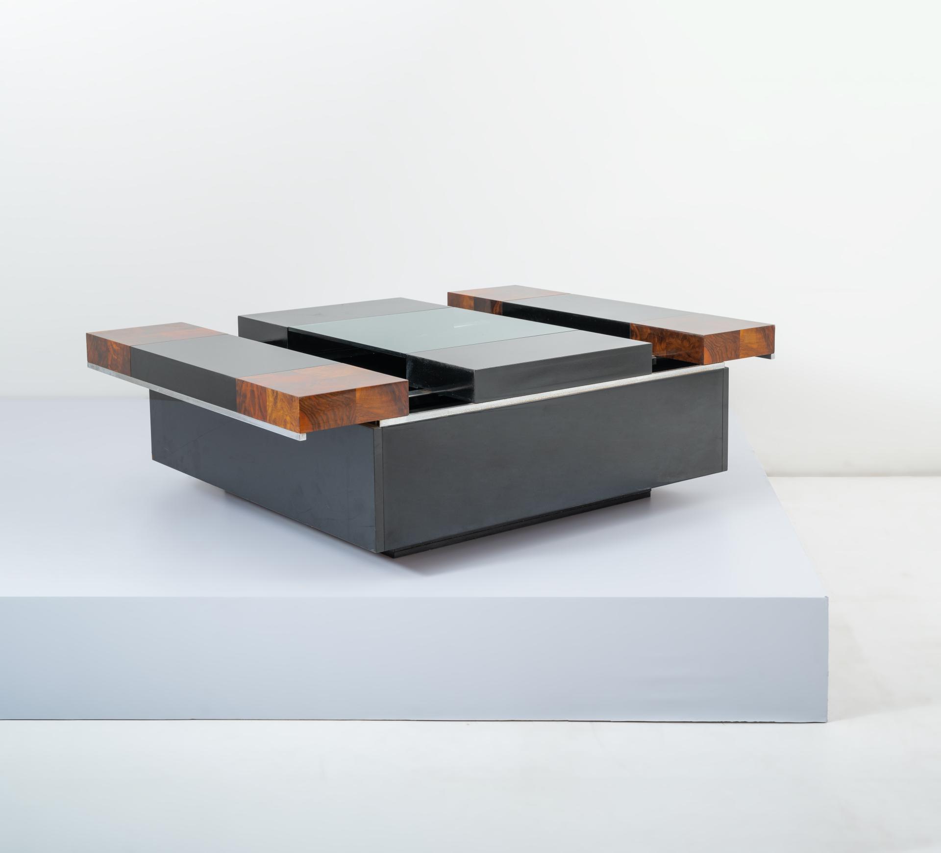 Tavolo basso apribile con pozzetto, struttura in legno e laminato laccato nero, acciaio, piuma in essenza. Qualche segno di usura.