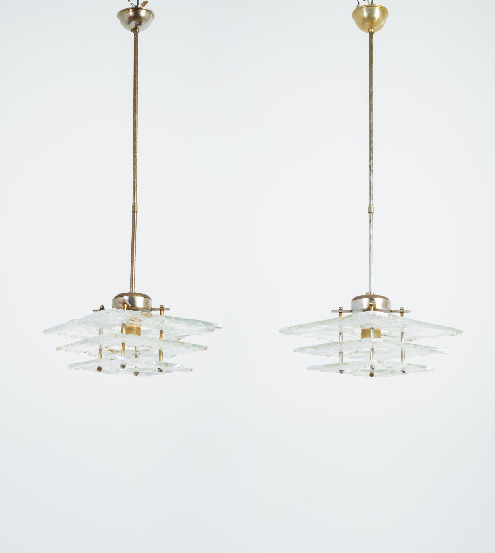Coppia di lampada a sospensione ad una luce, struttura in ottone e metallo cromato, diffusore composto da tre formelle quadrata sovrapposte in vetro corteccia trasparente e decorato con murrine informali lattime.