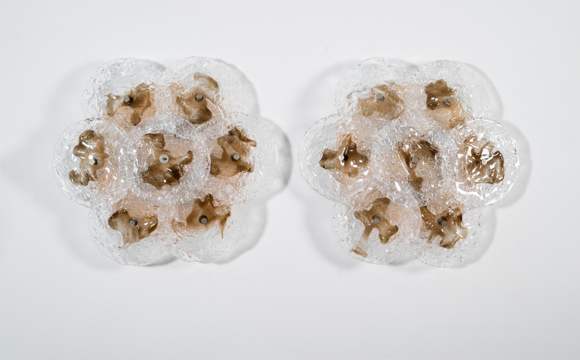 Coppia di lampade da soffitto a tre luci, struttura in metallo con diffusore circolare composto da formelle a disco in vetro corteccia trasparente e marrone.