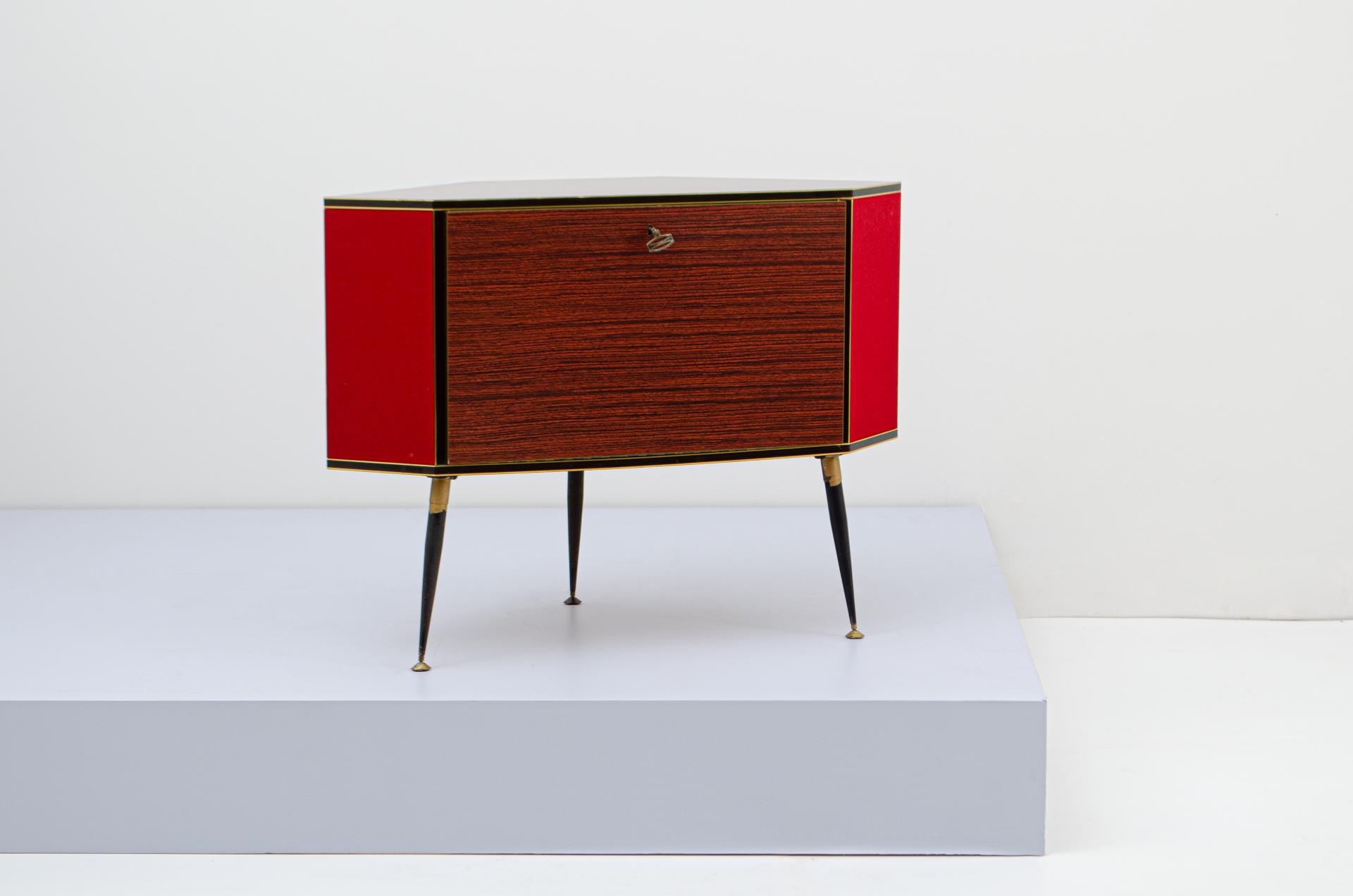 Mobile bar angolare, in legno esotico e legno laccato rosso, anta a ribalta con vano bar girevole diviso in due parti, un porta bicchieri ed un portabottiglie, minuterie in ottone. Piedi a spillo in metallo verniciato nero ed ottone.